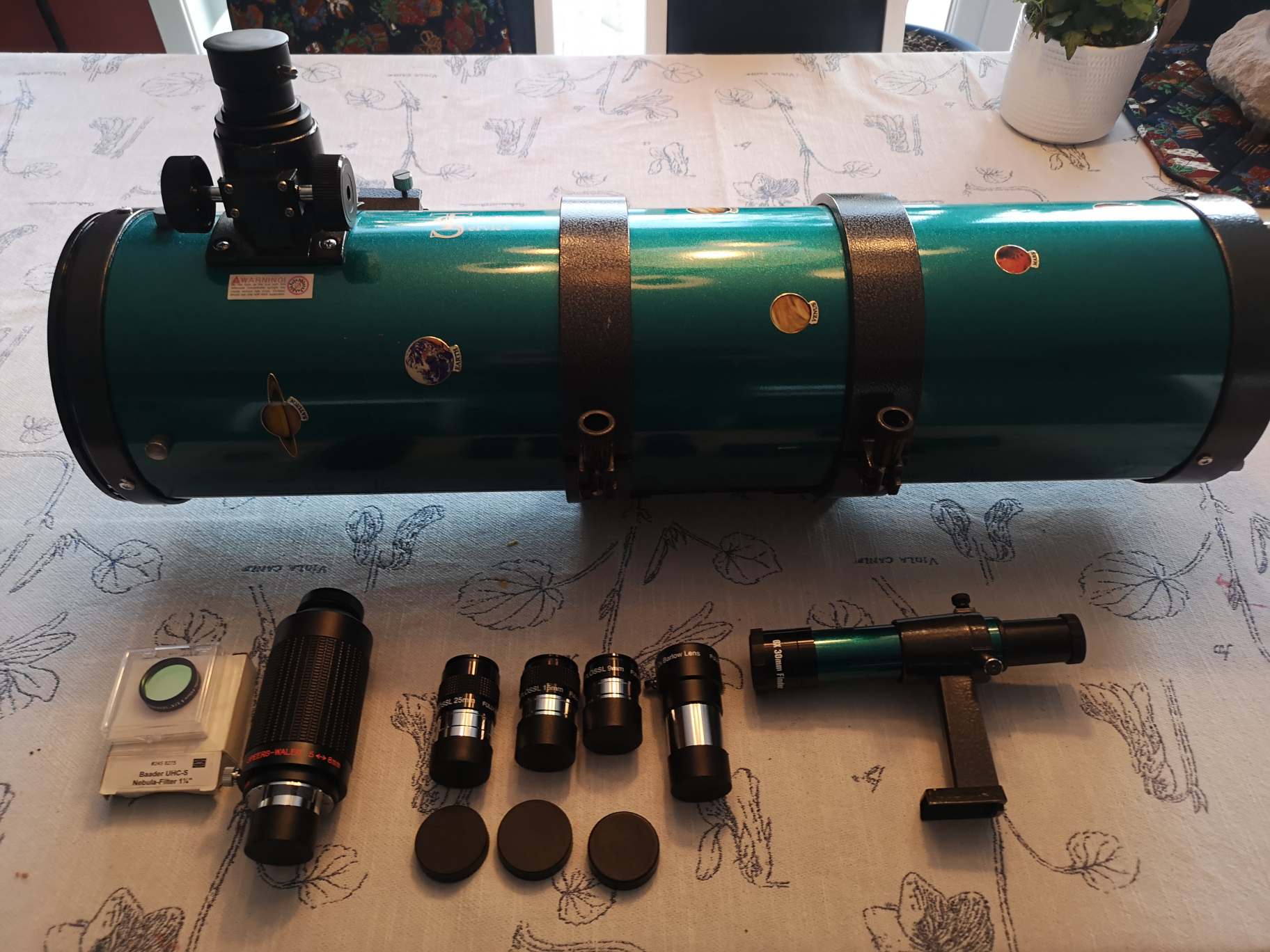 Okular: Super plössel 25mm, 15mm, 9mm; Antares Speers-Water 5-8mm (ca 80 grader synfält), 2x barlow lins