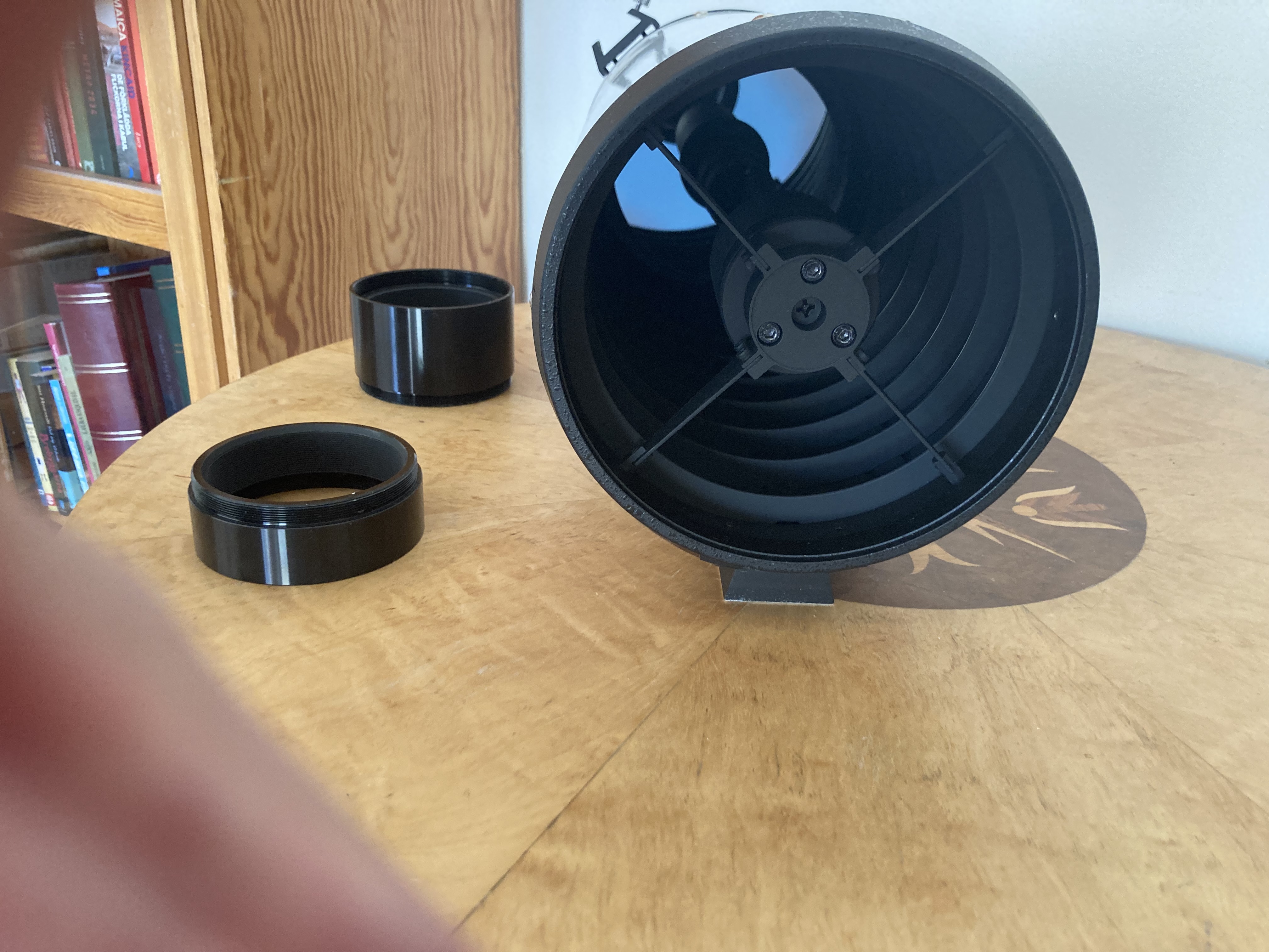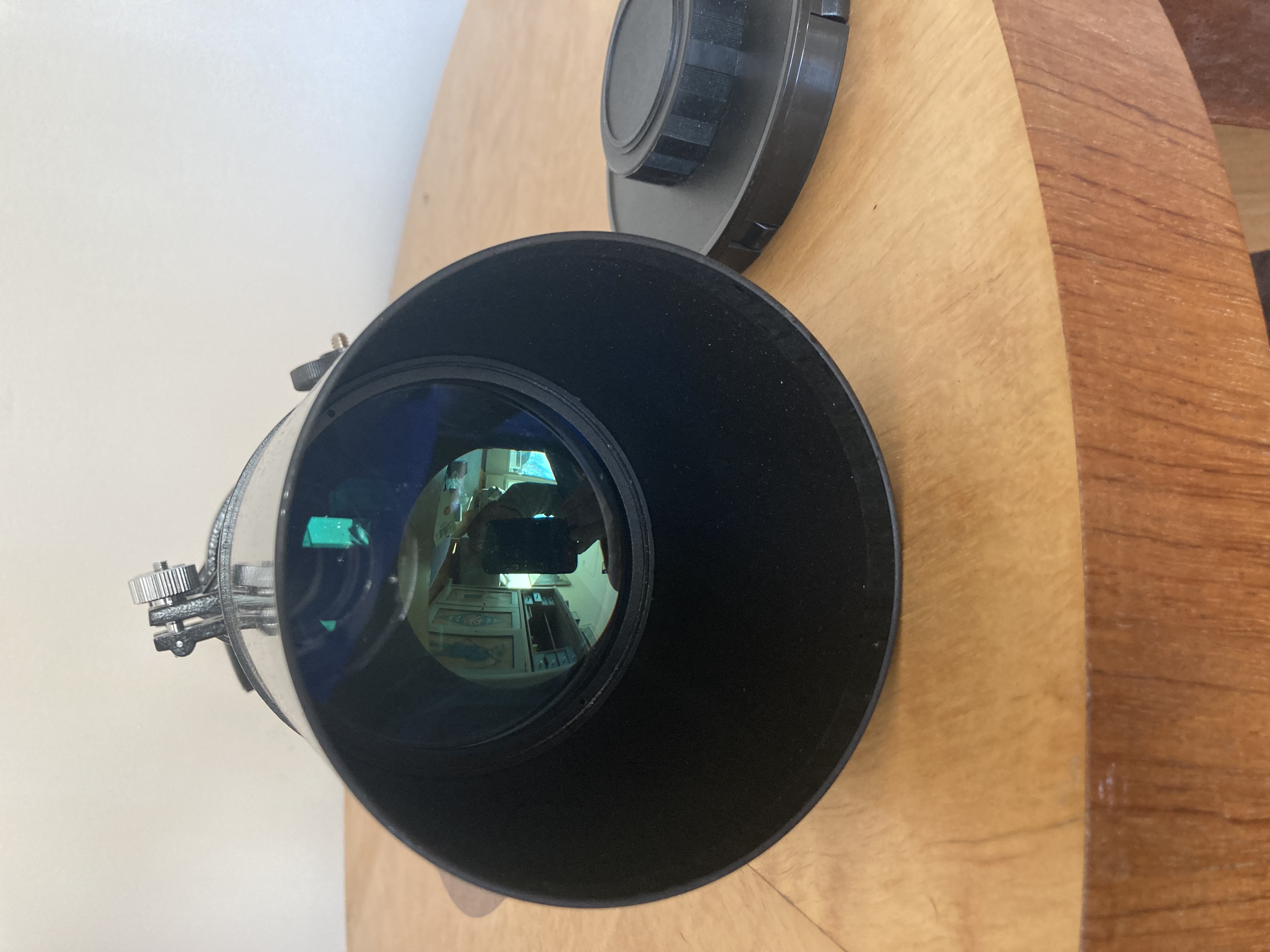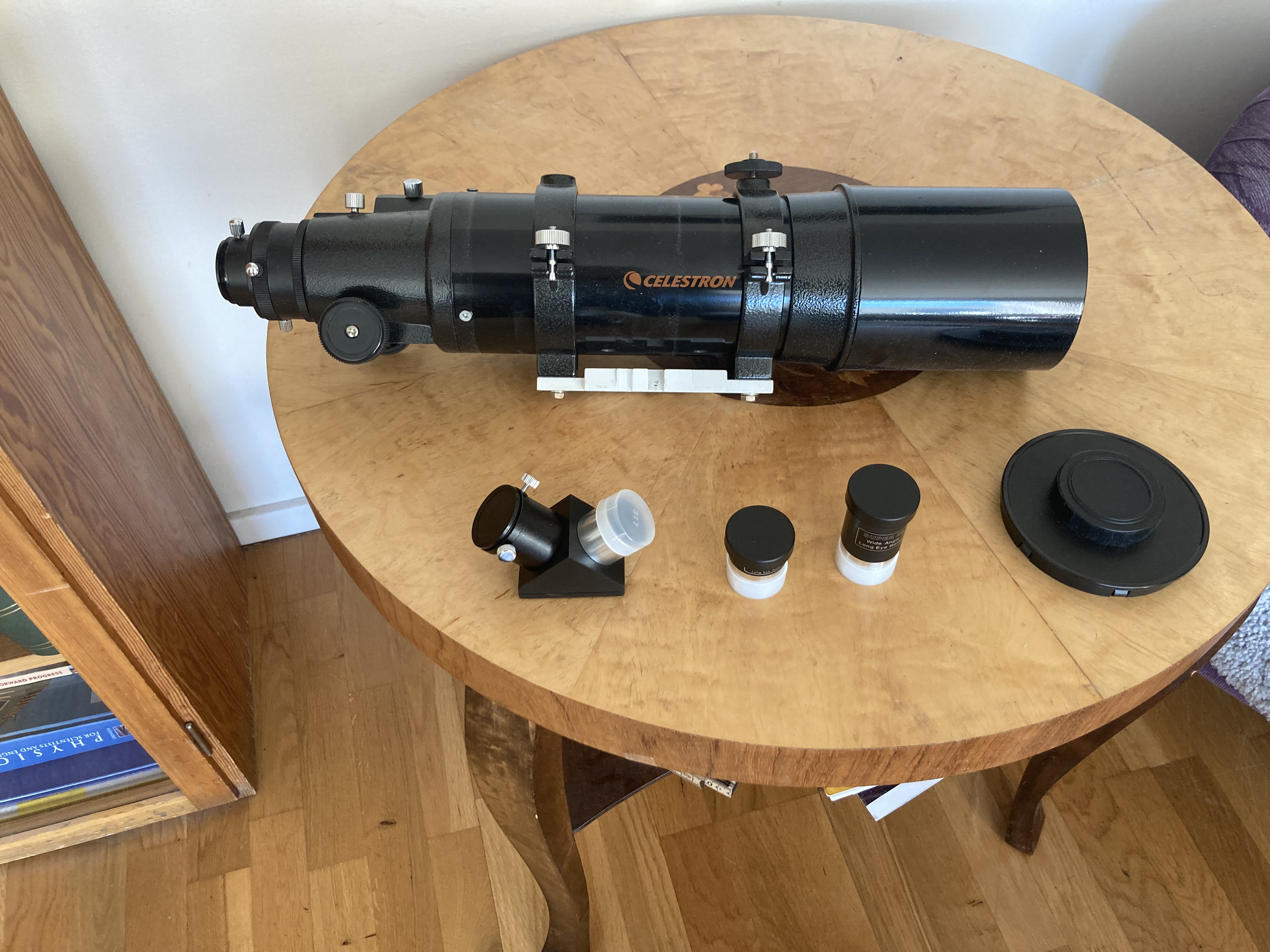 2. Teleskop, Celestron 102 mm F5 achromat. Något äldre med några daggfläckar på objektivet, annars i bra skick. Jag lägger till några generiska plössl-okular och en 90 graders diagonal som följt med något köp.