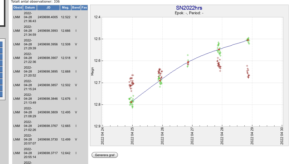 Vad gäller SN2022hrs så ser jag att den senaste nattens mätningar i AAVSO mestadels har V mellan 12.4 och 12.5. Kanske kommer 12.0 trots allt att uppnås? I så fall kommer max förvånansvärt sent. Om vi nu inte tolkar den vanliga uppgiften att det för typ Ia ska gå 15-20 dygn mellan explosion och max som ”15-20 dygn mellan explosion och nästan-max”. Vi får se vad som händer.