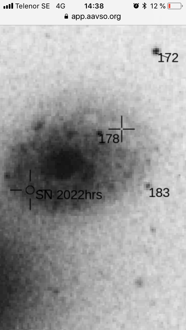 Tack. I förrgår skattade jag SN2022hrs till mag 12.5 med 12cm refraktorn. Hann inte obsa supernovan igår då jag förutom SN2022hkc obsade bl.a. kometen C/2019T4 (ATLAS) i Crater, försökte observera en asteroidockultation av (75816) 2000 BD6 (negativ obs) och såg 12 nya galaxer i Canes Venatici (201 nya galaxer bara i mars-april). Så många klara nätter vi haft i vår!