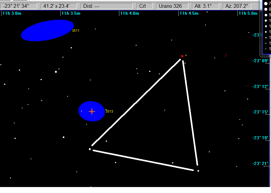 Triangeln som du ritat in är nästan en grad bred. Så brett synfält hade du väl inte? Vilken förstoring hade du? Sedan blir ju bilden i en SCT med diagonal spegelvänd. Jag tror att jag såg denna triangel av stjärnor, 15 bågminuter bred (spegelvänd bild). Såg en oval E-W, ytljussvag fläck ovanför den vänstra stjärnan av mag 10.7. Denna tolkade jag som NGC3513. Jag kan ha haft fel.