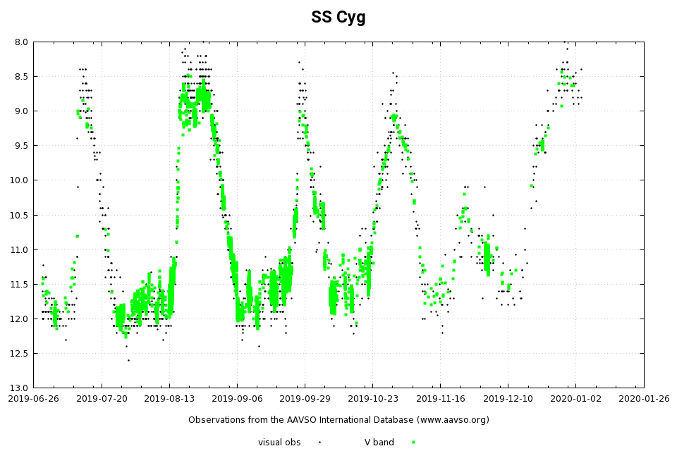 Redan omkring den 16 december 2019 passerade SS Cyg visuell magnitud 11.0 på uppåtgående. Inte förrän nu (21 januari 2020) passeras denna magnitud på nedåtgående! Har stjärnan någonsin under dess kända historia varit så ljus under så lång tid? Jag vet inte, det tar tid att kolla, men man kan konstatera att detta utbrott har varit alldeles osedvanligt utdraget.