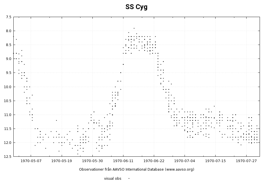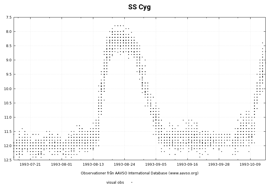 För många år sedan läste jag en artikel om SS Cyg där man hade bestämt ett magnitudvärde som måste överträffas för att det hela skulle räknas som ett utbrott. Detta har betydelse när man ska beräkna stjärnans utbrottsfrekvens. Om jag minns rätt (vilket inte är helt säkert) var det värdet 10.0.