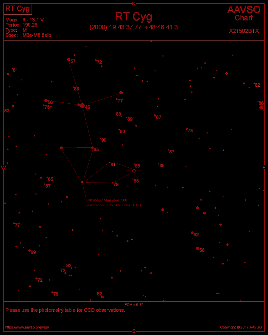 I den bifogade kartan saknas magnitudangivelse för HIP 96457 till mitt stora förtret då stjärnans sljusstyrka ligger mycket nära RT Cyg för tillfället.