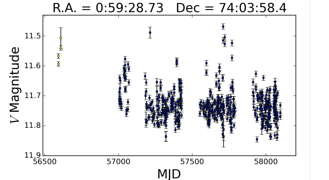 Stjärnan heter TYC 4623-157-1 och ingår i Gaia DR1. Två mätningar finns i APASS Epoch Photometry Database, den ena på V= 10.4692, den andra på 10.412. Eftersom APASS Epoch-observationerna gjordes med ett teleskop och inte med ett kameraobjektiv är bildskalan bättre än ASAS-SN:2.57 bågsekunder istället för 8. Två mätningar som bägge två ligger på den övre nivån.