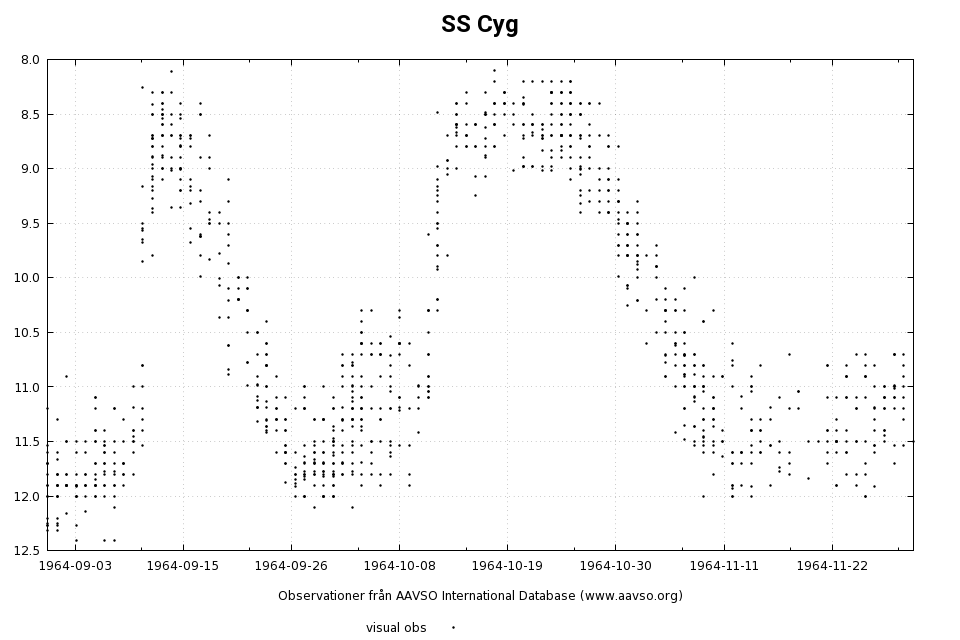 Jag har också börjat gräva lite i utbrottens historia hos SS Cyg, och hittade ett långdraget utbrott i oktober-november 1964. Men om man utgår från att utbrottets längd är den tid som spenderas vid magnitud 10.0 och ljusare, så är trots allt det nu aktuella utbrottet några dygn längre.