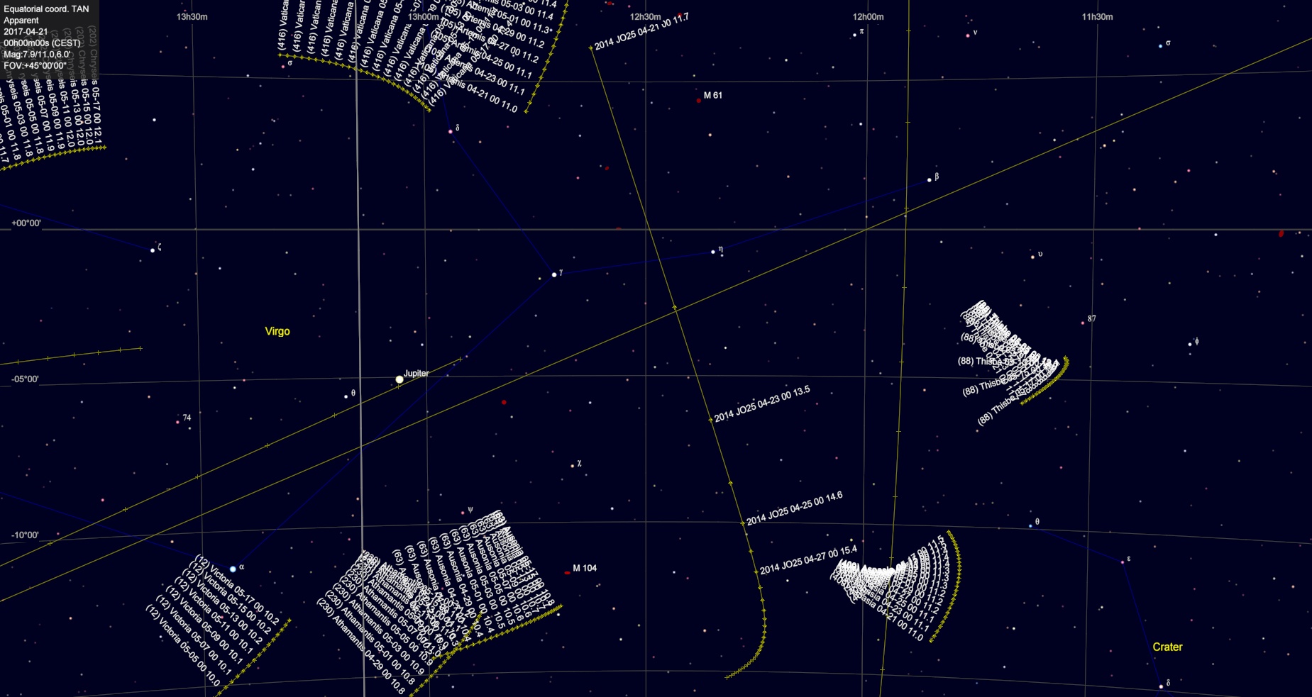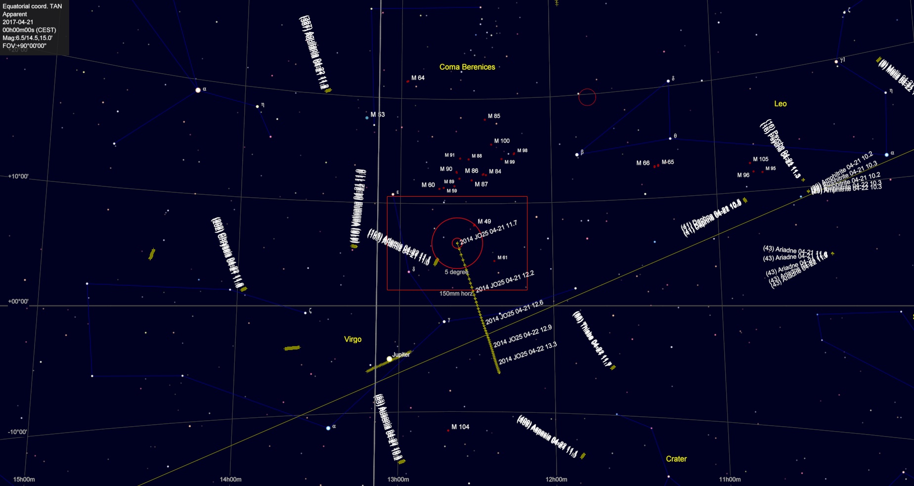 De två kartorna ovan förstår jag inte riktigt. Småplaneten ligger på en helt annan del av himlen vid de angivna tidpunkterna.