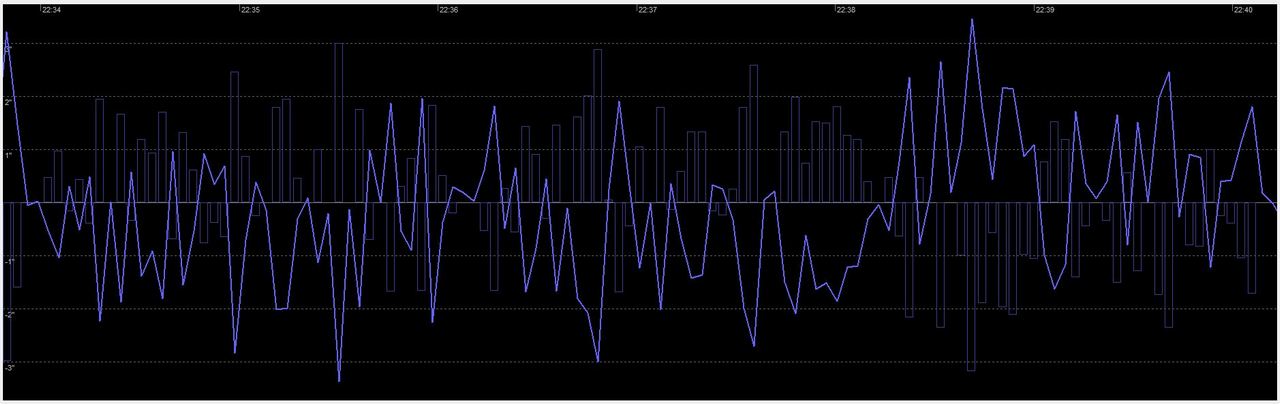 Ett utsnitt ur samma session som du refererade till, visar runt kl.22:38 mycket riktigt flera pulser i samma riktning utan att det resulterar i en vändning. Snabbare justeringar, längre pulser, högre aggressivitet känns spontant som att det borde kunnat fått kurvan rätt fortare, men jag tror inget av det är något jag kan påverka. Aggressiviteten var just där satt till 100% och Hysteres 10%.