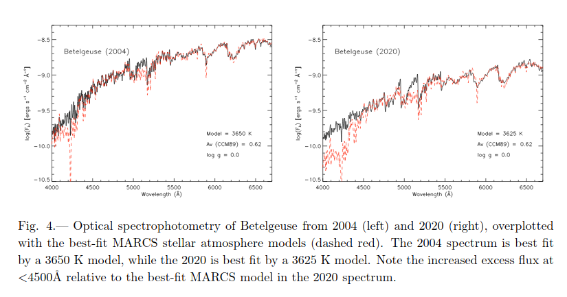 Betelgeuse ljusminskning tycks att vara orsakad av "interstellar dust grains" enligt en studie av Emily M. Levesque & Philip Massey [1]. De försökte ta reda på om ljusminskningen skulle kunna vara orsakad av en temperatur minskning. De tog spektrum av Betelgeuse och jämförde det med prov tagna av Betelgeuse själv och andra röda jättar i galaxen, genom att jämföra TiO (Titanium Oxide) spektralinjer kom dem till slutsatsen att temperatur minskning under denna period har varit 50K vilket skulle innebära en minskning på 0.4 magnitud, inte tillräcklig eftersom magnituden minskning var över 1.