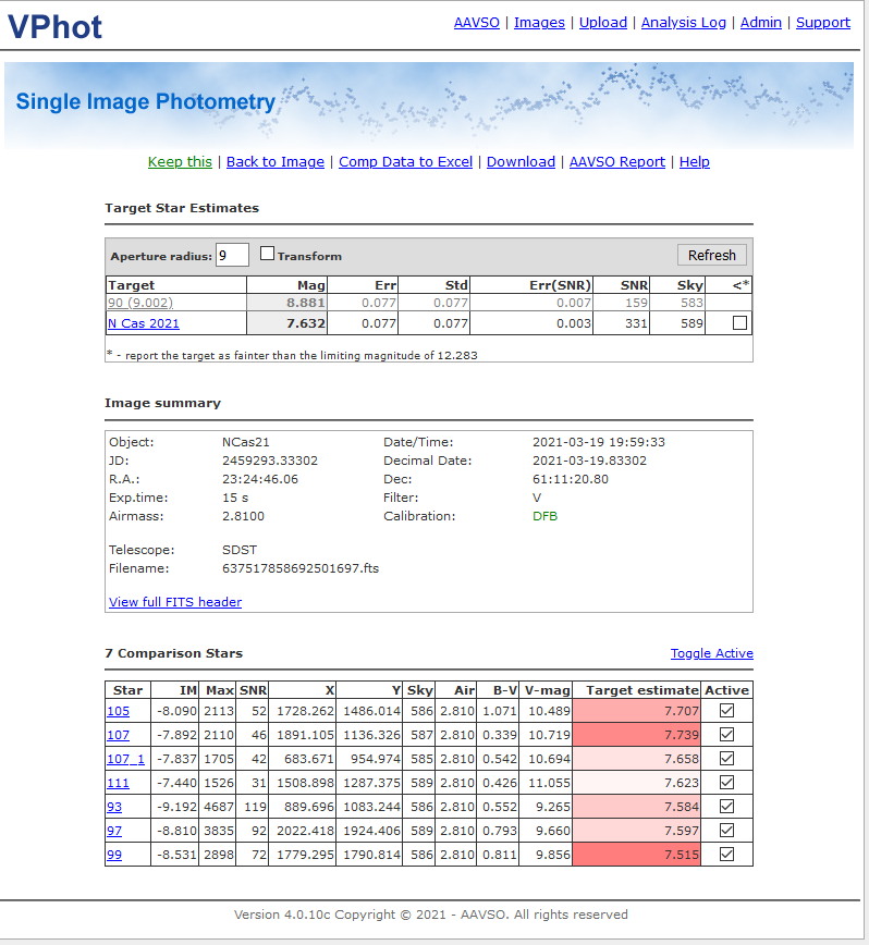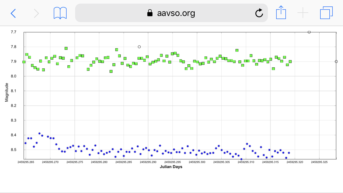 Gjorde analysen i VPHOT och får en magnitud på 7.6 (V-filter) med en avvikelse på 0.077, exponeringen tagen klockan 21 idag. Jag har en check start och 7 comp stjärnor (tog bort en hel del som gav för avvikande resultat, som flesta låg längs kanterna. Jag har för mig att man bör få en avvikelse som är lägre än 0.1.