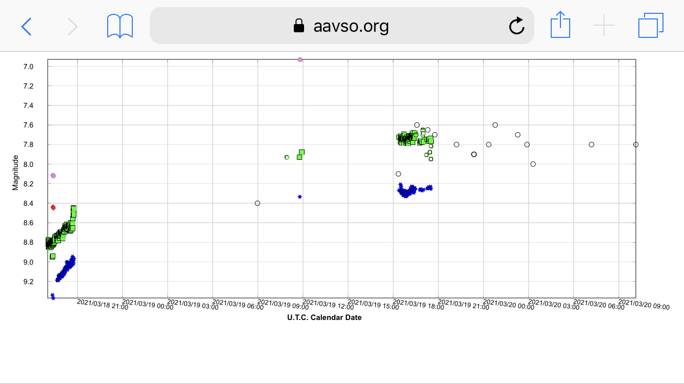Magnus gjorde än en gång en superb tidsserie (V och B) igår kväll (21 mars), se diagram nedan. Novan låg i stort sett konstant kring V = 7.9 under hela serien. Längst till höger ser vi också Davids skattning, mvis 7.9.