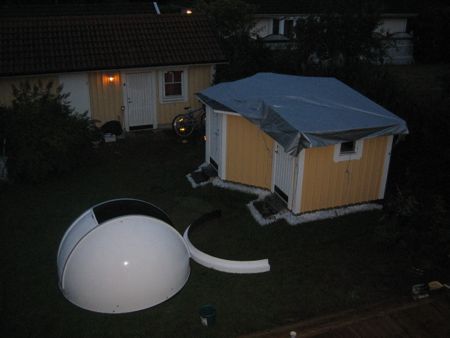 Först gällde det att tänka till, var ska det stå, hur ska det se ut? Efter det var det dags att börja gräva och gjuta plintar. Markarbetet klart Grunden Här följer lite bilder från arbetet med väggar och tak Här är det nästan klart, väntar bara på kupolen från Siriusdomes Kupolen har anlänt, jippi!! Slutresultatet I den högra delen är det vinterbonat kontrollrum.