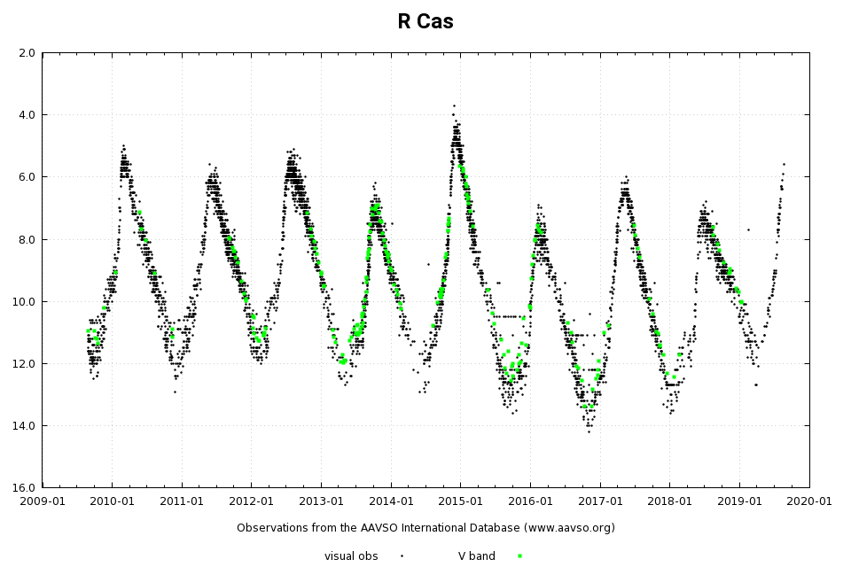 R Cas är på väg mot en ganska ljust maximum enligt senaste observationerna (bl.a. de rapporterade av Gustav). Den är redan inom räckhåll för fältkikare och kanske för blöta ögat också.