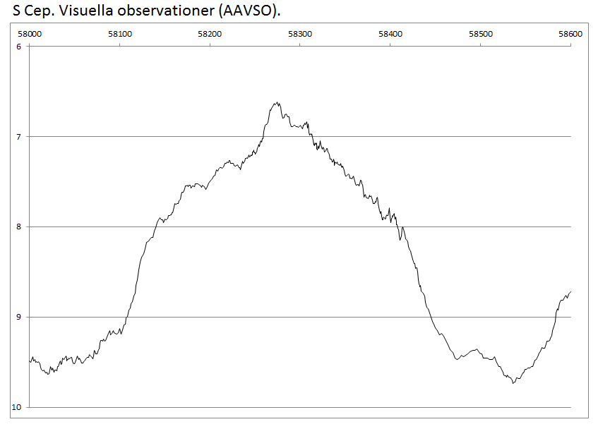 S Cep är en ljus mira som nu är på uppgång, visuell magnitud 7.6 enligt senaste skattningen i SVO.