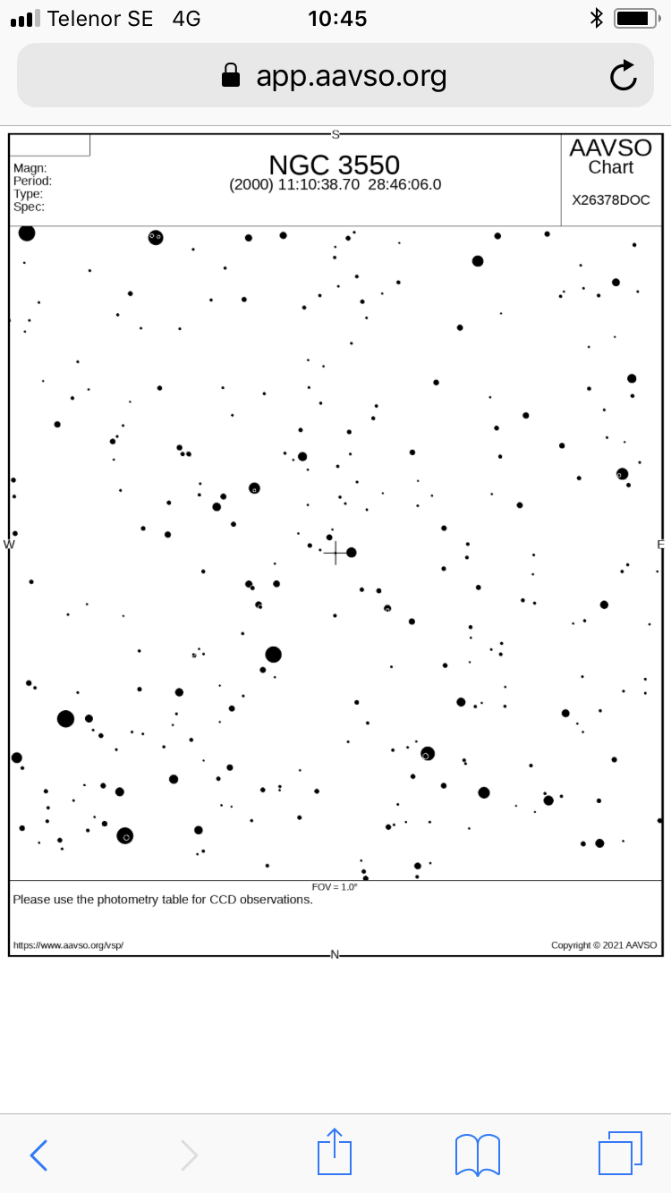 När det gäller NGC 3550 så kunde jag inte motstå frestelsen att plocka fram tre AAVSO-kartor. De har alla söder uppåt (som i din Newton) och omfattar 5x5 grader, 1x1 grad, 20x20 bågminuter.