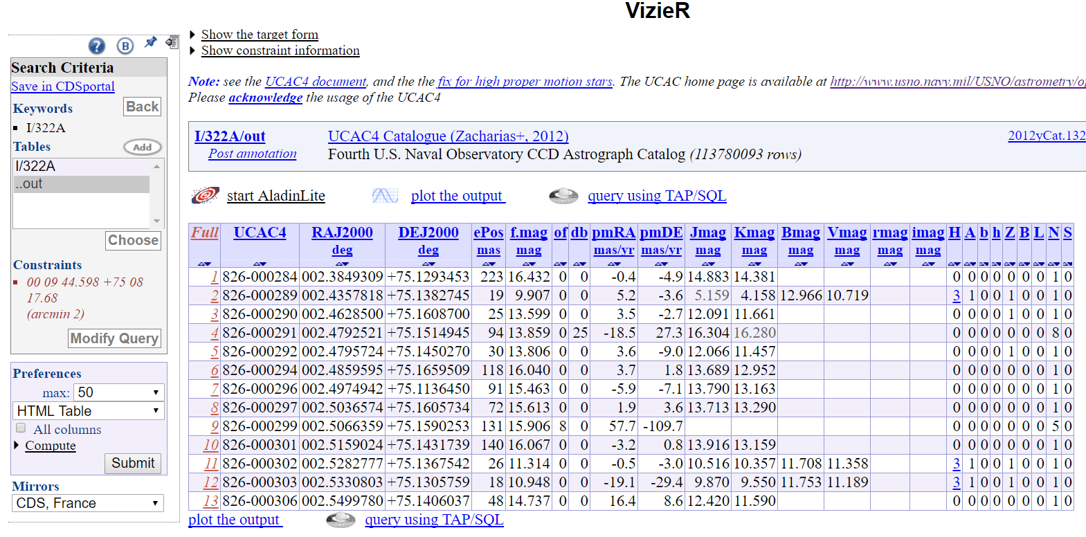 4. UCAC4 koordinater efterfrågades för mina stjärnor så jag sökte i UCAC4 stjärnans position och fick fram den bifogade tabellen men ingen av stjärnorna
