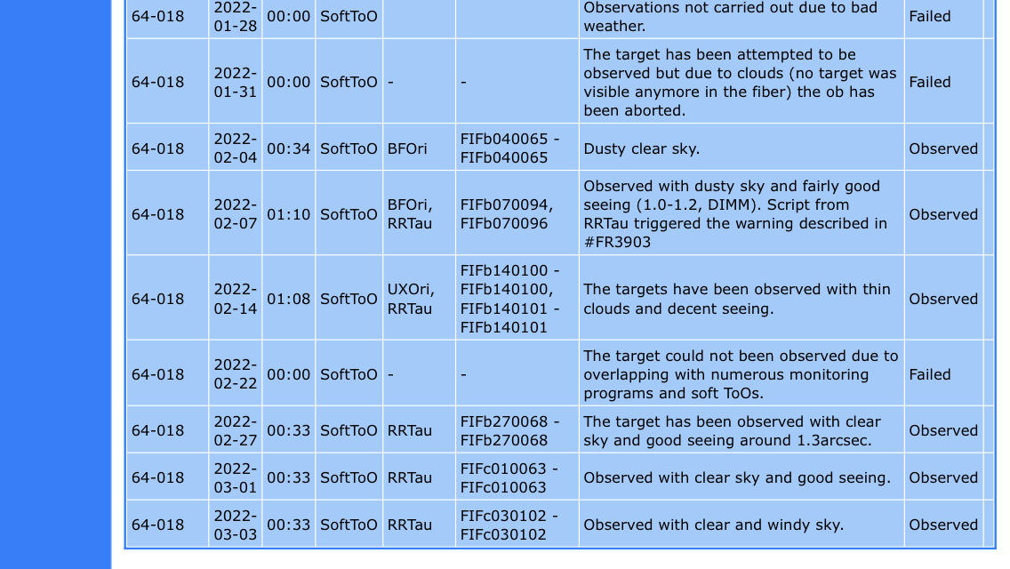 Nya fina BVRI-mätningar för de fyra uxorerna har rasslat in i SVO. Uppdateringar har sänts till NOT-teamet.