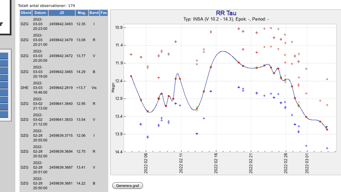 Den kommande natten (mars 4-5) blir det ingen spektroskopi av RR Tau, eftersom ett spanskt forskarlag då har tiden inbokad. Men minimet håller nog på ytterligare några dygn, och alla magnitudobservationer är förstås av stort värde så att det blir en kontinuerlig ljuskurva.
