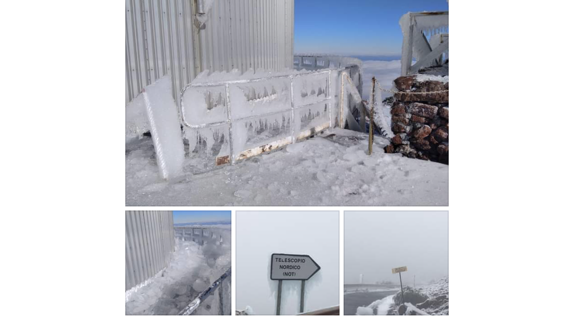 Efter några dygn med synnerligen vintrigt väder över NOT, som har omöjliggjort observationer, börjar det nu gå att avfrosta observatoriet. Se aktuell bild.