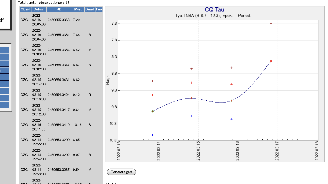 All teleskoptid på NOT var upptagen igår, vi får se hur det blir ikväll. RR Tau är nu inne i årets andra fullskaliga dimming event! Kurvan var igår (20 mars) fortfarande konvex vilket tyder på visuell magnitud någonstans 14.2-14.5 ikväll.