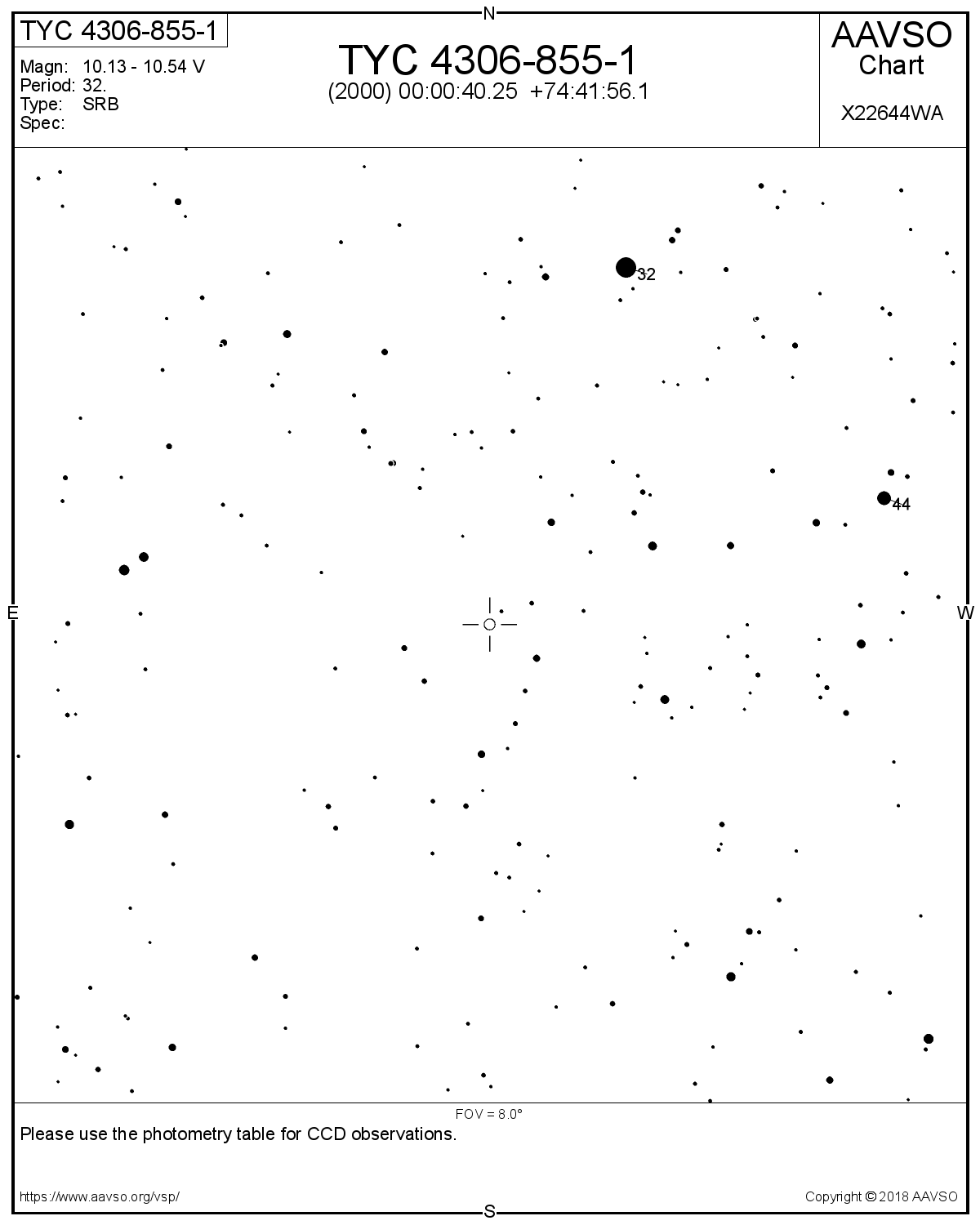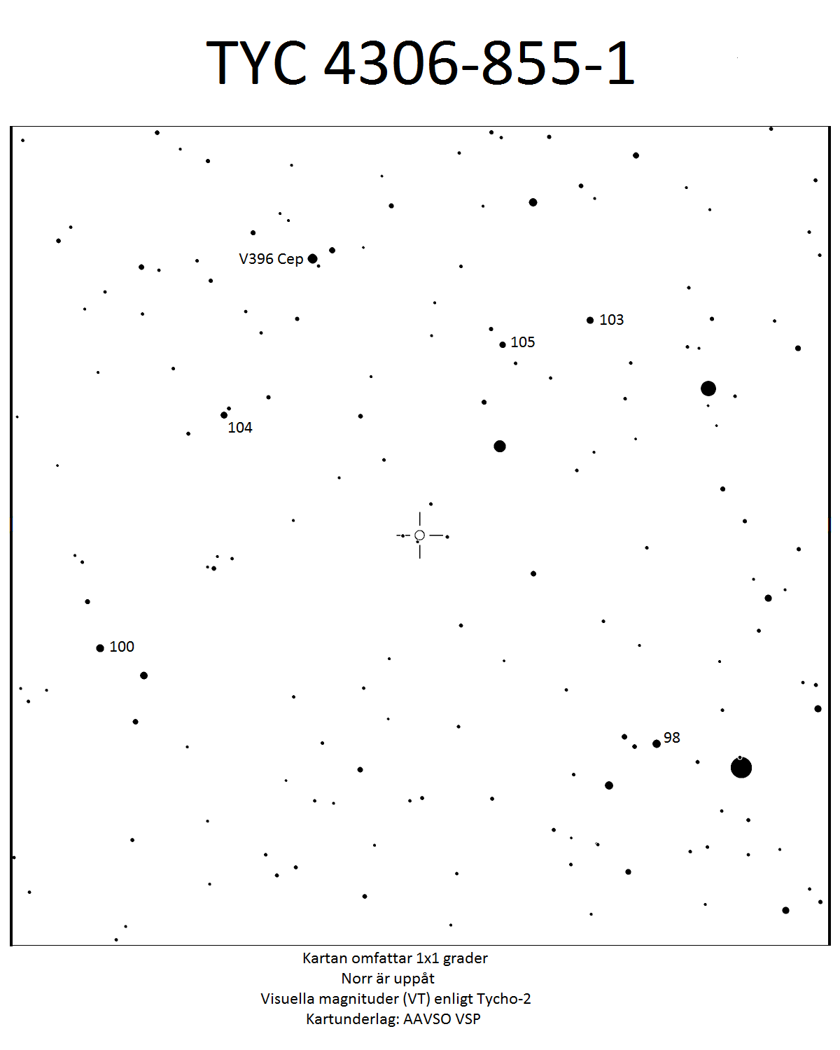 Nedan har jag lagt in två kartor för den variabel du upptäckte senast, TYC 4306-855-1. På översiktskartan (8x8 grader) är stjärnan Gamma Cephei utmärkt "32". På detaljkartan (1x1 grader) finns de lämpligaste jämförelsestjärnorna utmärkta med visuella magnituder. Man kan säga att denna variabel i första hand är lämplig för CCD-fotometri, men även med traditionella visuella metoder bör det gå att ana variabiliteten om man gör många obsar.