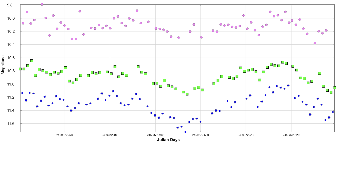 Nedan ges Magnus BVI-mätningar den gångna natten (10-11 juli) samt en längre AAVSO-kurva.