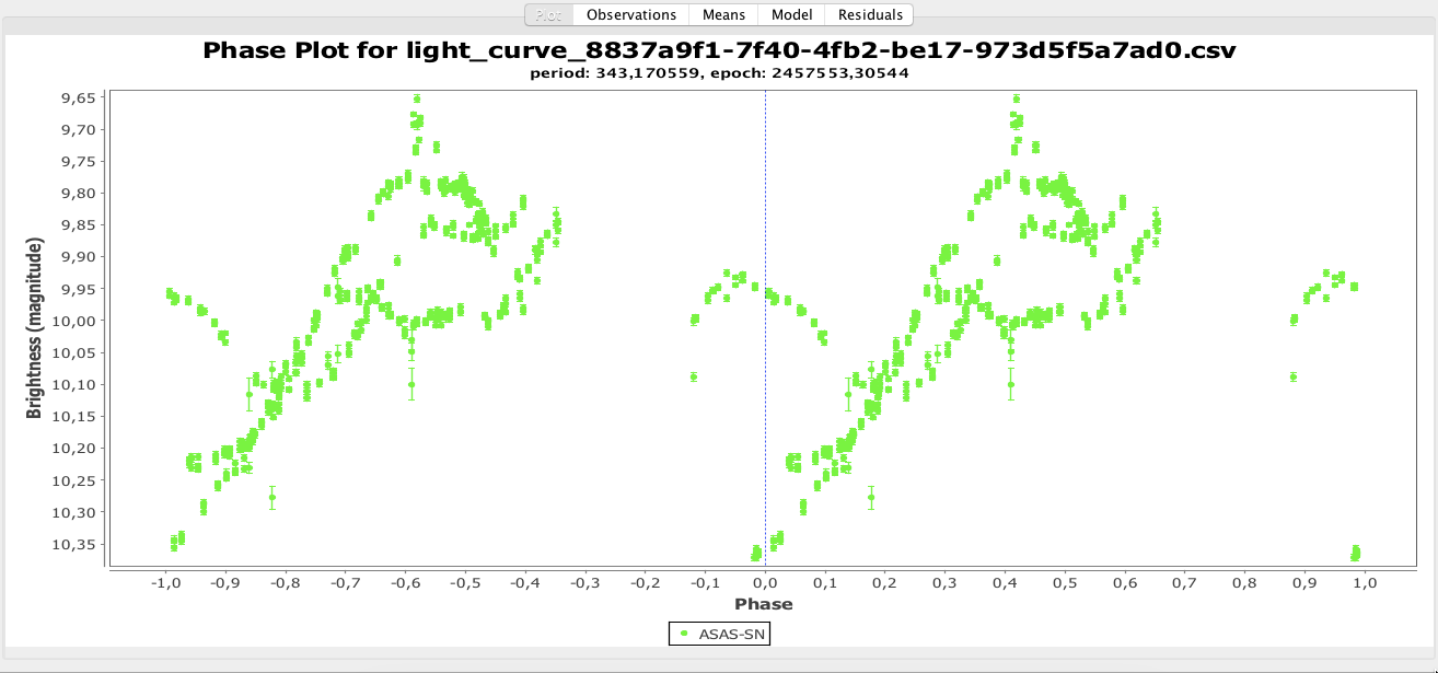 En snabbkoll med Fouriermetoden DC DFT Standard Scan i Vstar ger 343 dygn som den starkaste signalen. Men det blir ingen snygg fasplott: flera överlagrade perioder?