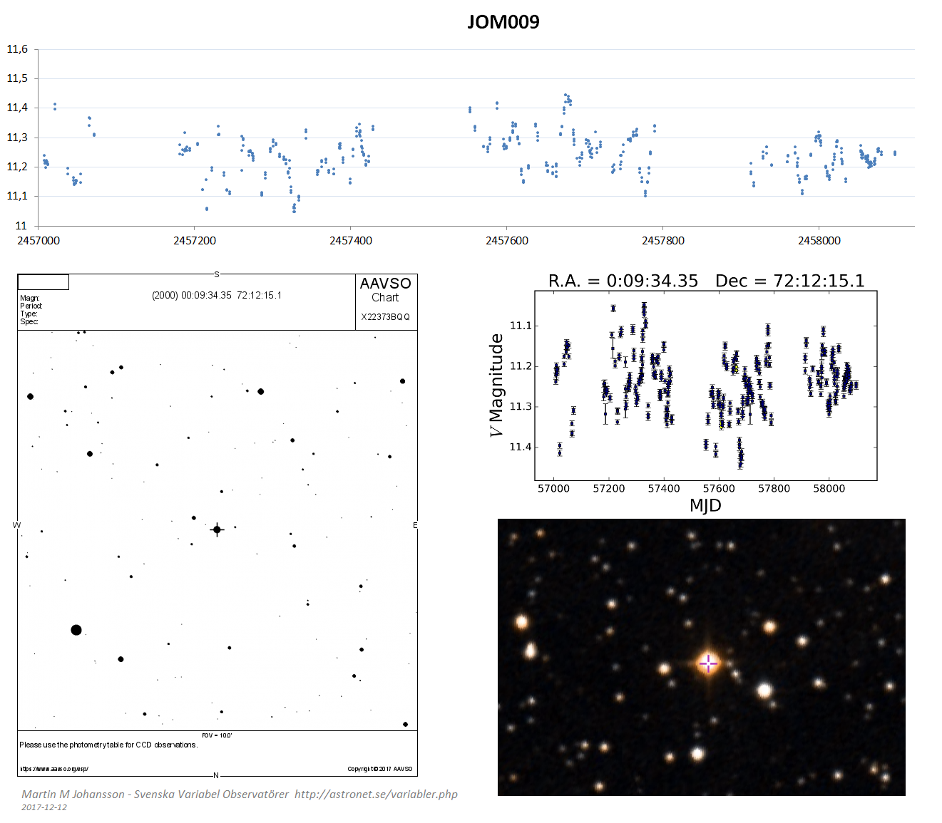 Vi har inte riktigt satt ned foten när det gäller publicering osv. Egentligen vore det rätt bra om de nyupptäckta variablerna kunde hamna i VSX (den internationella variabeldatabasen, som drivs av AAVSO) allt eftersom upptäckterna görs. Då skrivs upptäckarens namn också in där, och man kan säga att upptäckten är säkrad för framtiden. Upptäckare är den som har den aktuella stjärnan i sin batch-fil, i detta fall du. Man kan också tänka sig att vi tar säg 10 nya variabler åt gången, kanske är det mest rationellt? Vad säger Thomas K? Det är alltid en viss procedur att få med nya variabler i VSX, Sebastian Otero är en noggrann person (vilket är utmärkt bra!).