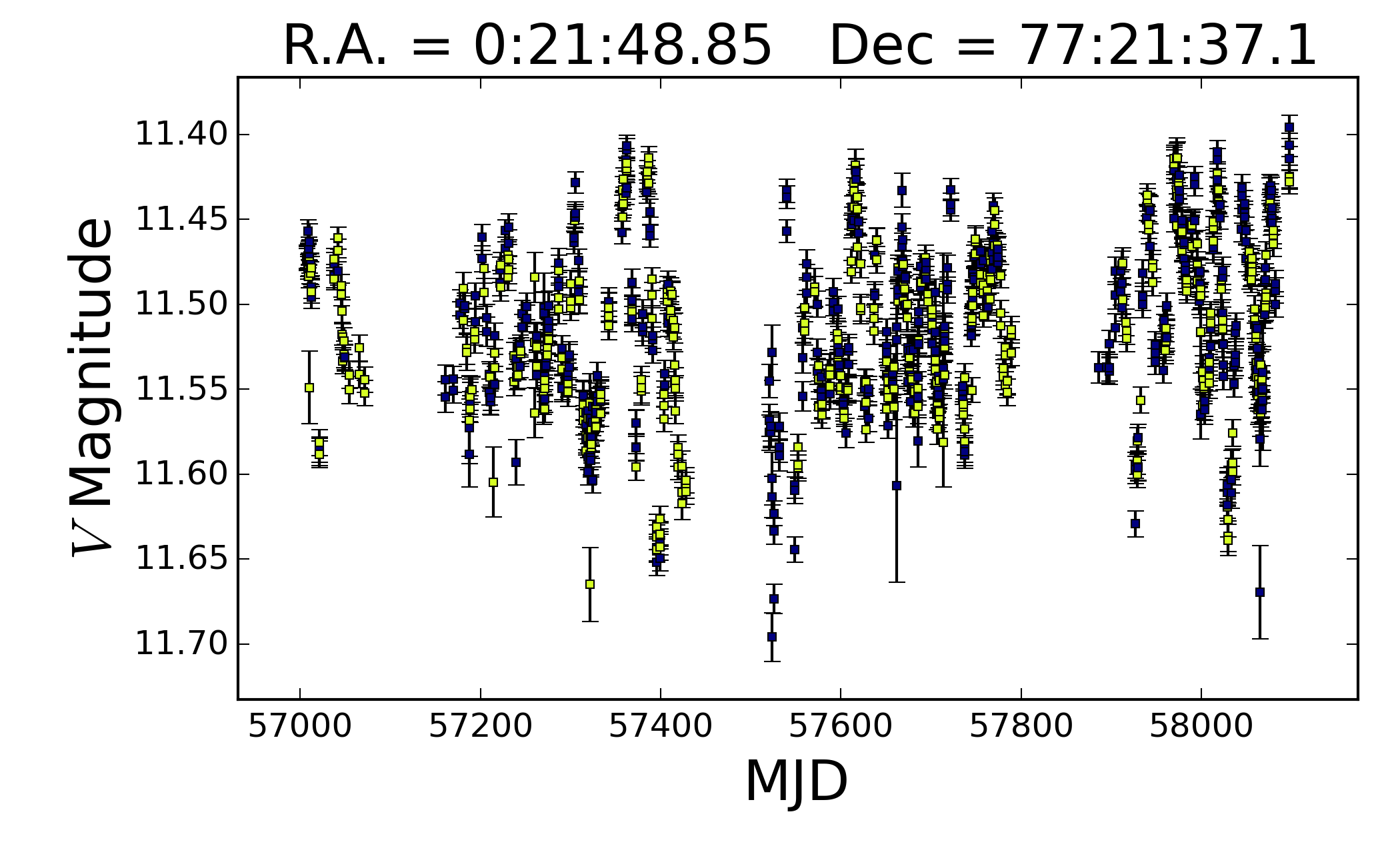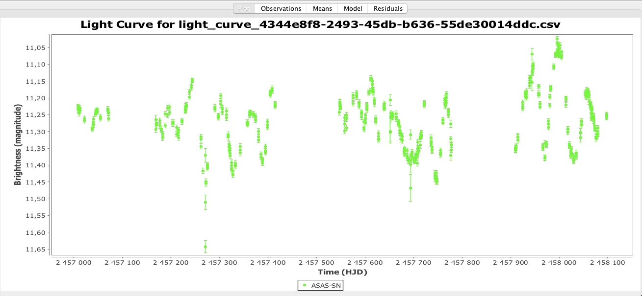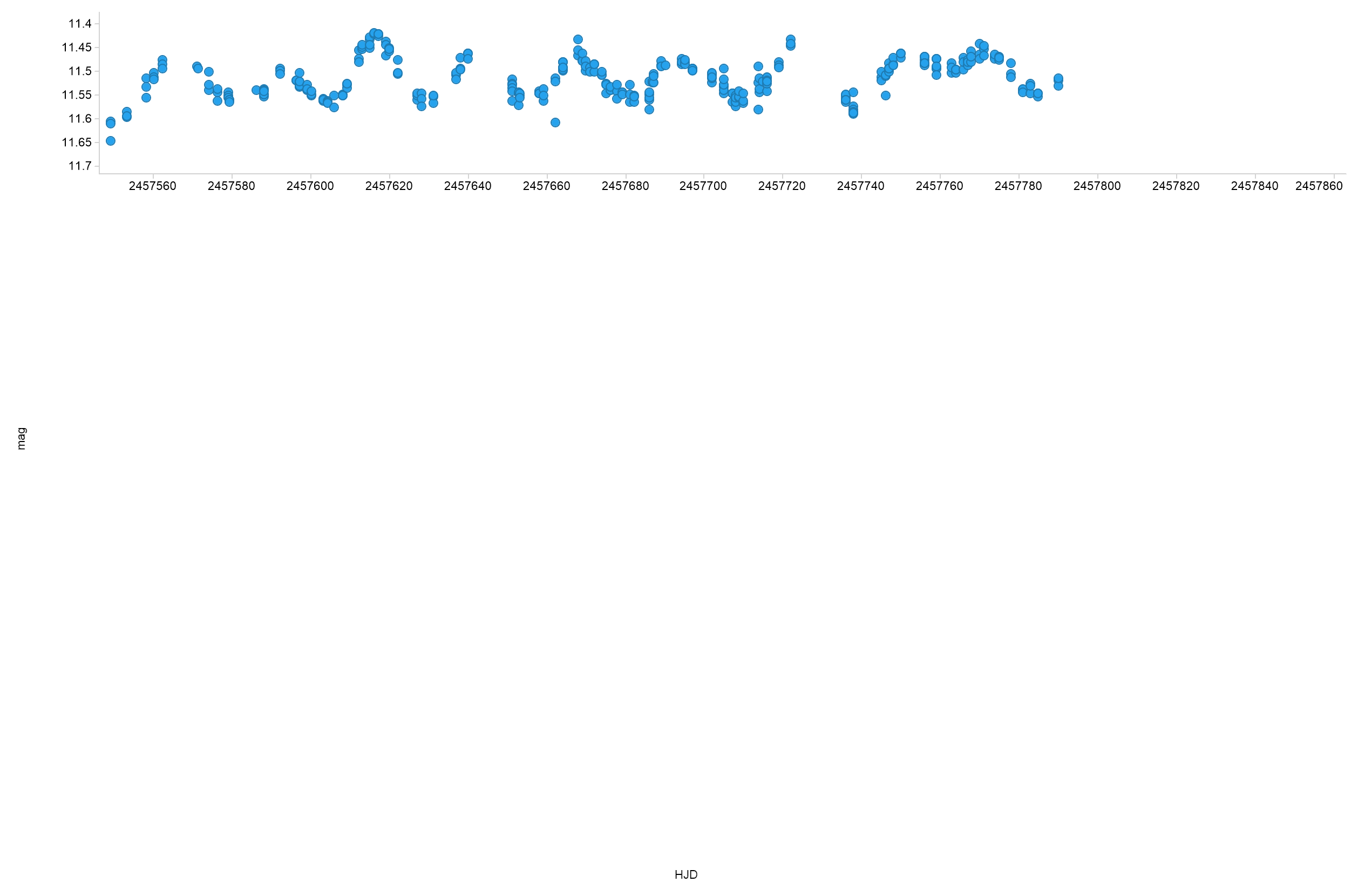 Katarina: Den var verkligen ett gränsfall. Den ser ut att ha en tydlig variation, men amplituden ligger ungefär inom den slumpmässiga variation ASAS-SN verkar ha. Vad tror Hans? Jag kan göra periodberäkning på den om du mailar mig länken eller excel-filen.