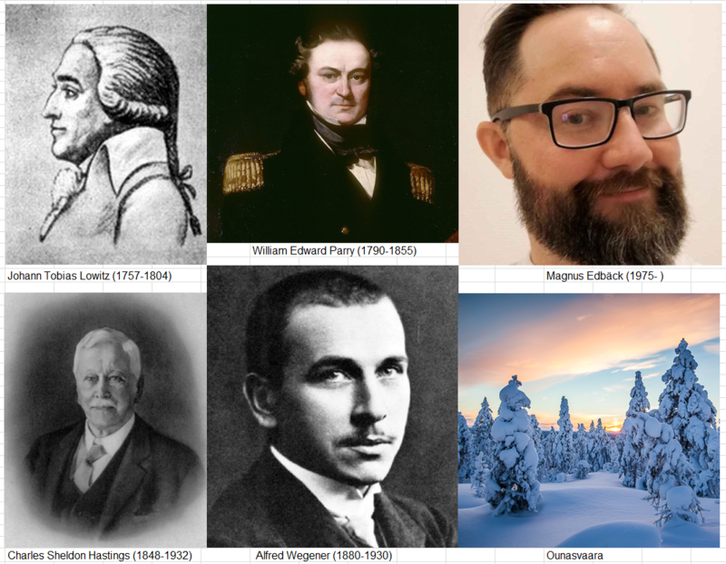 Om ni undrar över de personer (plus ett berg i norra Finland) som ingår i namnen på halokomponenterna i Magnus bild, så ges nedan ett litet porträttgalleri.