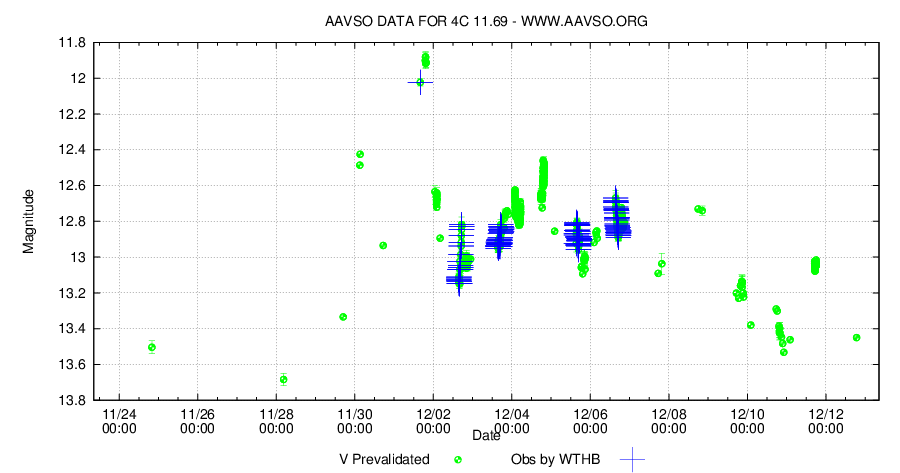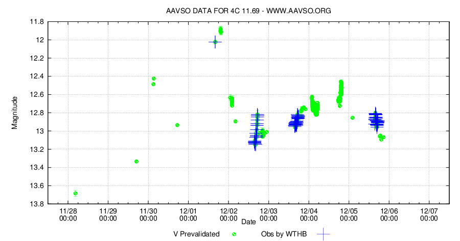 Aktuella V-mätningar av 4C 11.69 från AAVSO:s databas ses i diagrammet nedan. Tomas Wikanders mätningar markeras med blåa kryss.