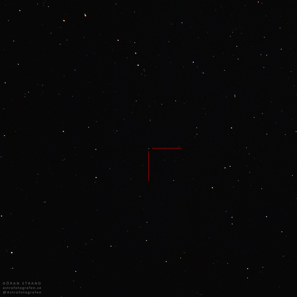 Ikväll fick jag min första bild av detta spännande och avlägsna objekt. 12 stycken 10 sekunders exponeringar vid ISO 1600, fokallängd 600 mm f/5,6. Svårt att inte häpnas över vilken resa denna pixel gjort.