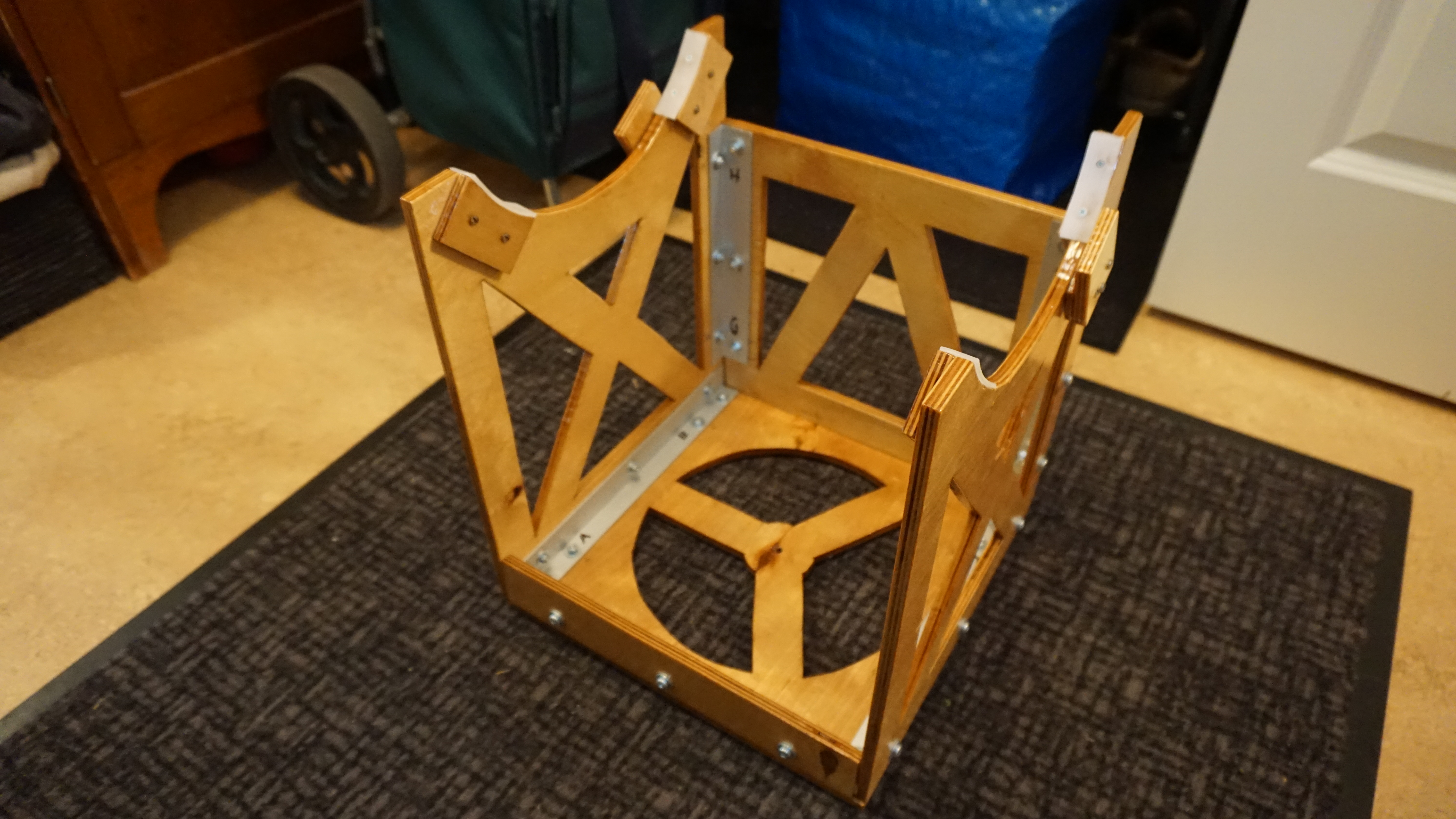 Jag bestämde mig för att bygga en ny rockerbox i 9 mm plywood istället för 12 mm, och skaffade en elektrisk sticksåg för att kunna göra stora trekantiga ursågningar i sidorna. Konstruktionen är i form av en byggsats där jag skruvar ihop det hela med hjälp av vinkelprofiler av eloxerad aluminium längs kanterna.