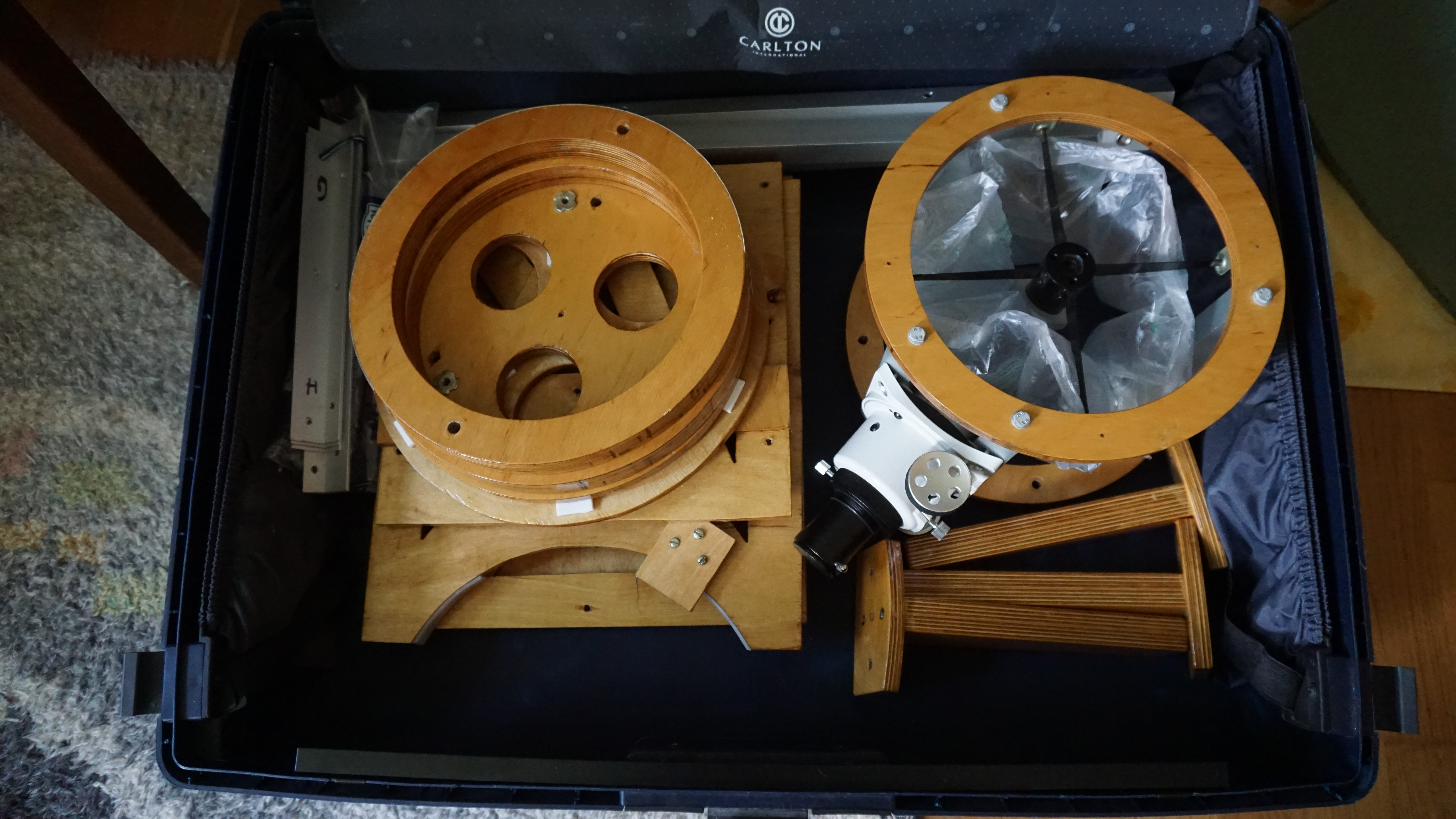 Tuben tar jag isär. Primärspegeln hamnar i en låda för sig. Sekundärburen låter jag sitta ihop som en enhet. Altitudhjulen tar jag loss. Al-stagen tar jag loss.
