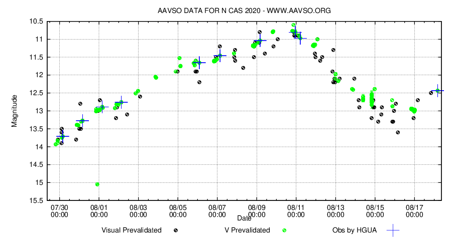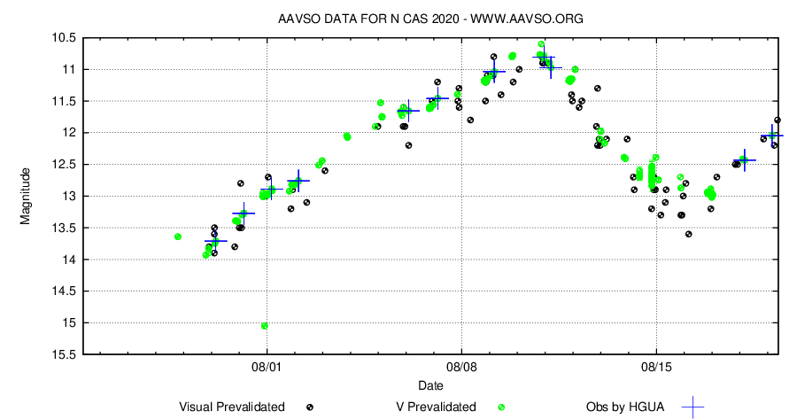 Nova Cas 2020 är ett skolboksexempel på ett objekt där amatörastronomers arbete ger frukt. De stora professionella observatorierna utdelar knappast teleskoptid till kontinuerlig fotometrisk uppföljning natt efter natt, men inom amatörastronomins värld sker ju detta utan problem.