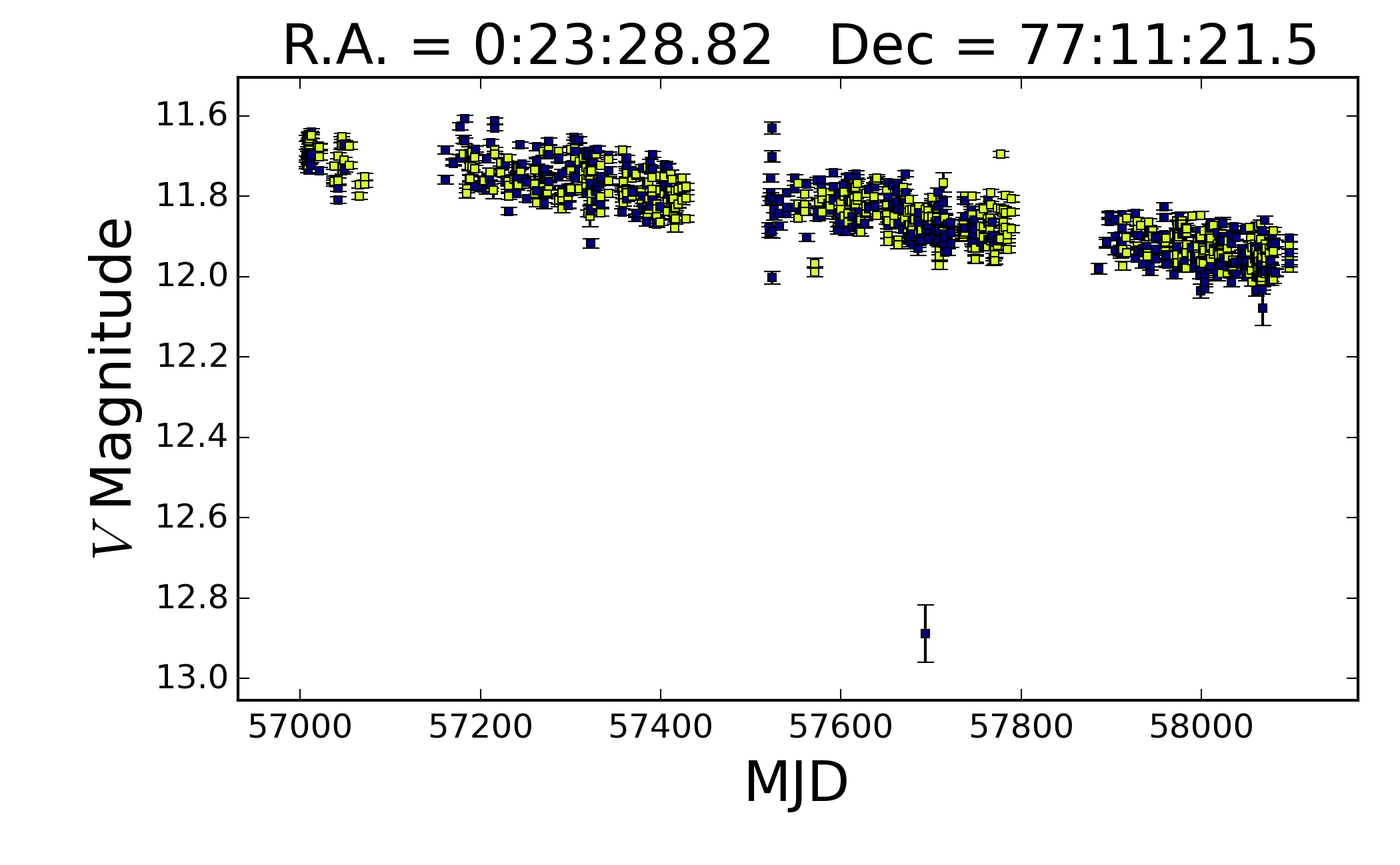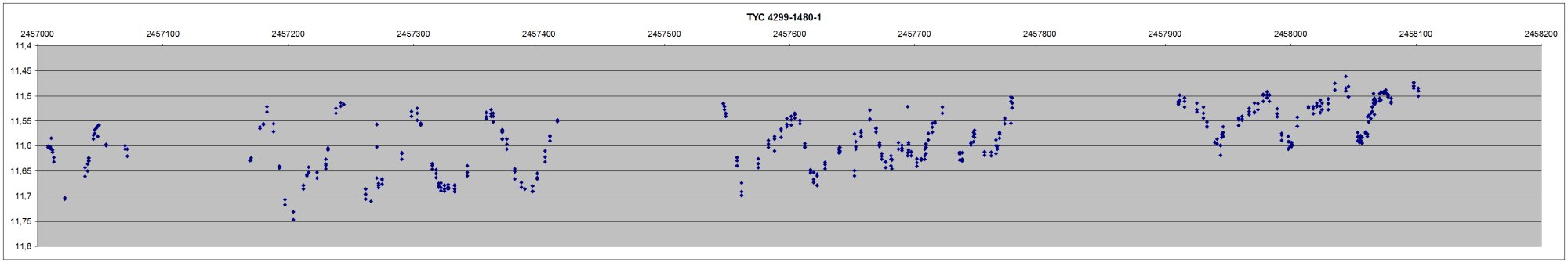 Förutom att den tycks variera mycket med korta perioder så har den kontinuerligt tappat i ljusstyrka de senaste 1500 dygnen från ca 11.6 till ca 12.0