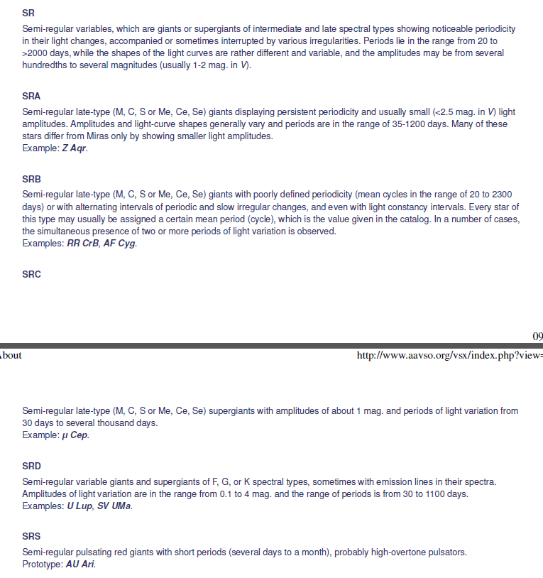 De klasser som är mest aktuella i vårt projekt är de som framgår av skärmklippen nedan (från ovan länkade dokument). Lägg märke till den relativt nya klassen SRS (AU Arietis-variabler) som är röda pulserande jättar med kort halvregelbunden period, mellan några dygn och ca 30 dygn.