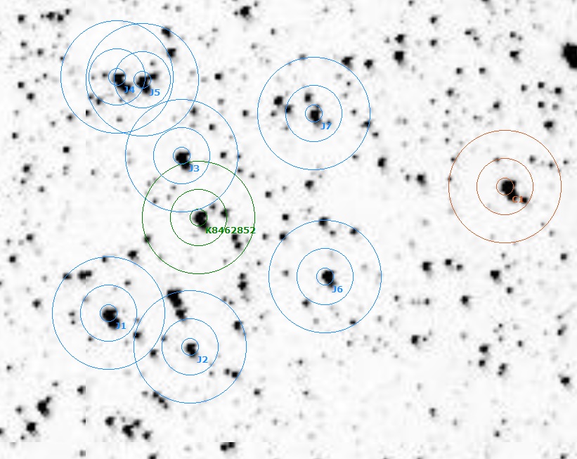 Efter att ha extraherat rätt kanal från de 53 FFI-bilderna laddade jag upp dem till AAVSO:s VPHOT. Jag använde samma jämförstjärnor som i artikeln. Här är en närbild på Tabbys stjärna med jämförstjärnor från en FFI.