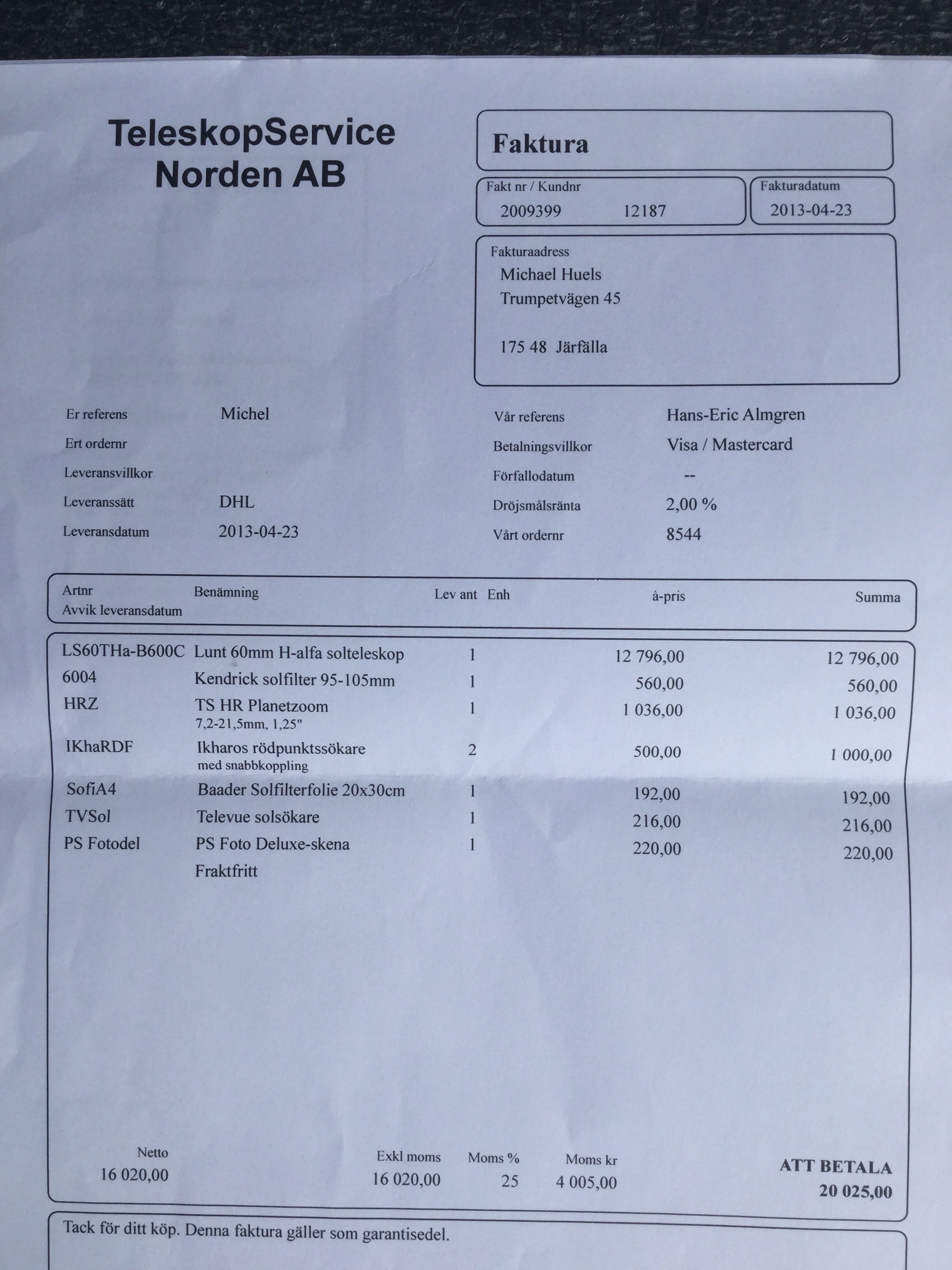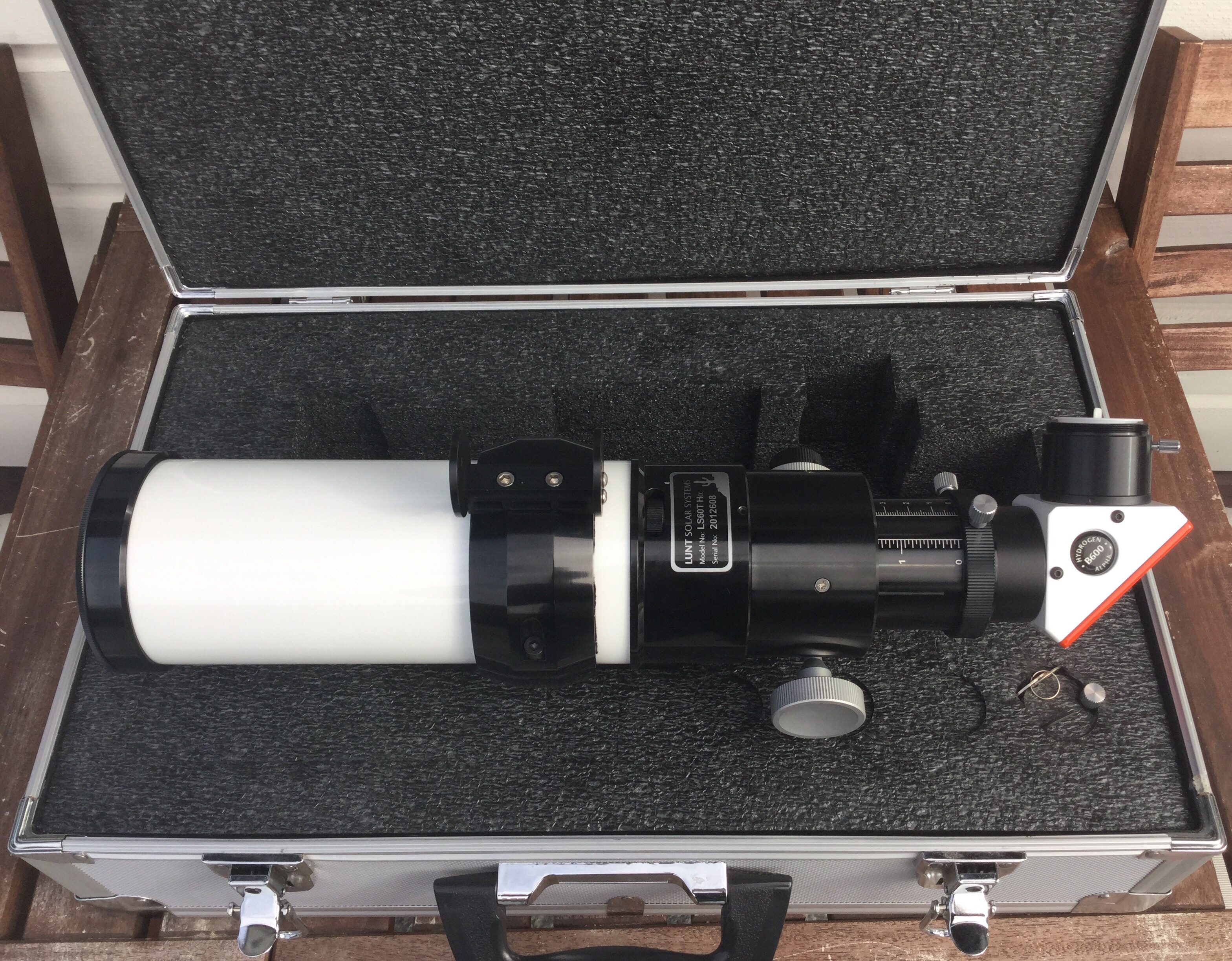Lunt LS60/B600 H-alpha scope: new price was 13,012 sek including the Teleview solar finder - I ask 8,200 sek plus shipping. This scope comes with aluminum carry case and was used no more than 10 times! It is like new condition! INCLUDES tube ring, solar finder and the special diagonal. This is a bargain at that price.