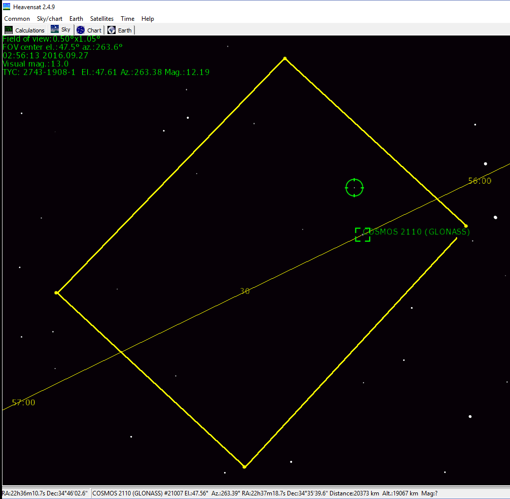 Bilden konverterad till .fits av Astrometry.net, koordinater för hörn (och satellit) från SAOimage DS9, presenterade över prognos från HeavenSat 2.4.9