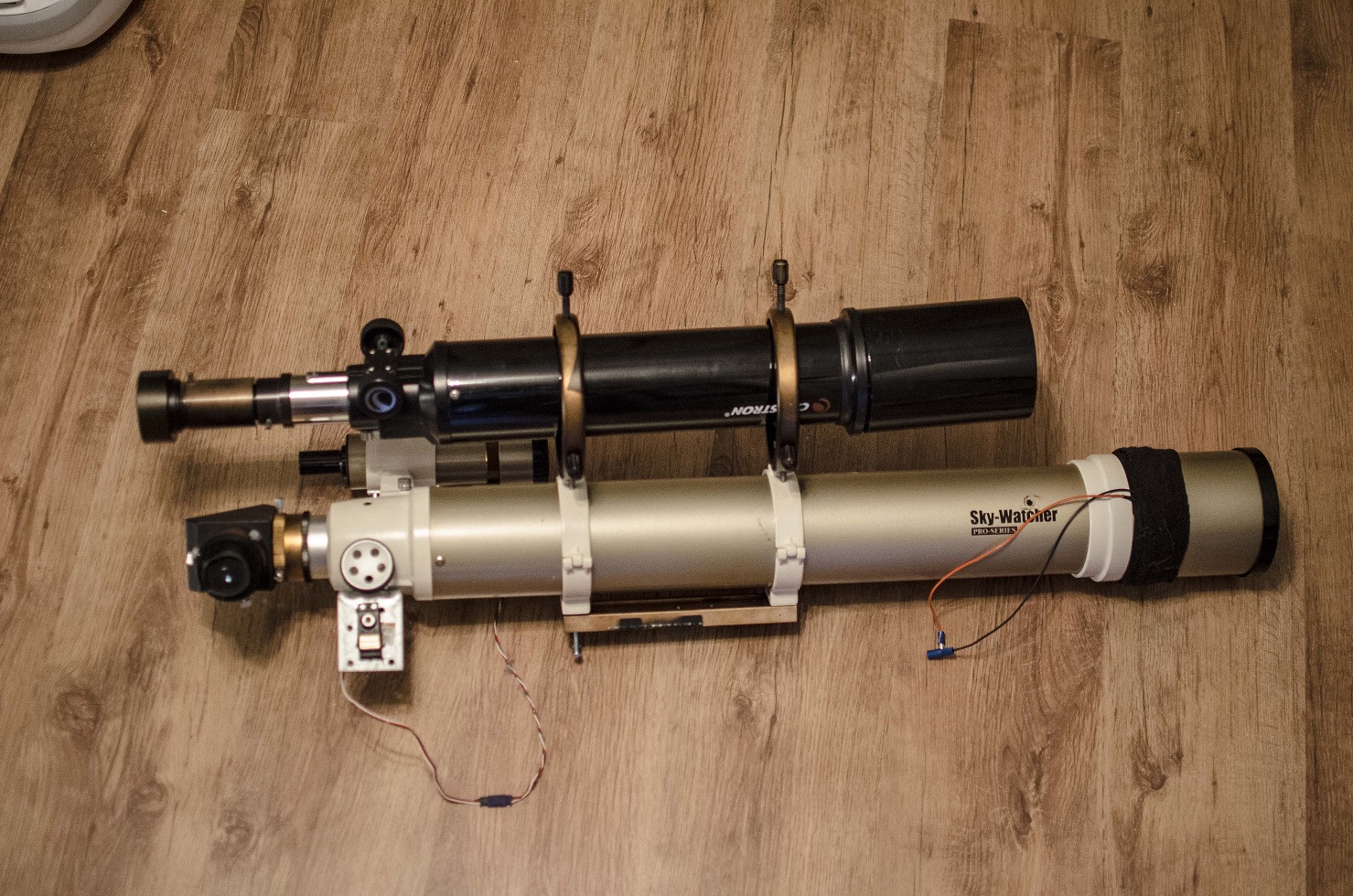 Har även monterat en platta och ett rc servo som man kopplar ihop med fokuseraren ifall man vill köra motorfokus (diy version) som man då styr med medföljande servotestare så slipper man vibrationer när man fokuserar. allt det går att ta bort ifall man inte gillar lösningen, har inte ändrat något på teleskopet.