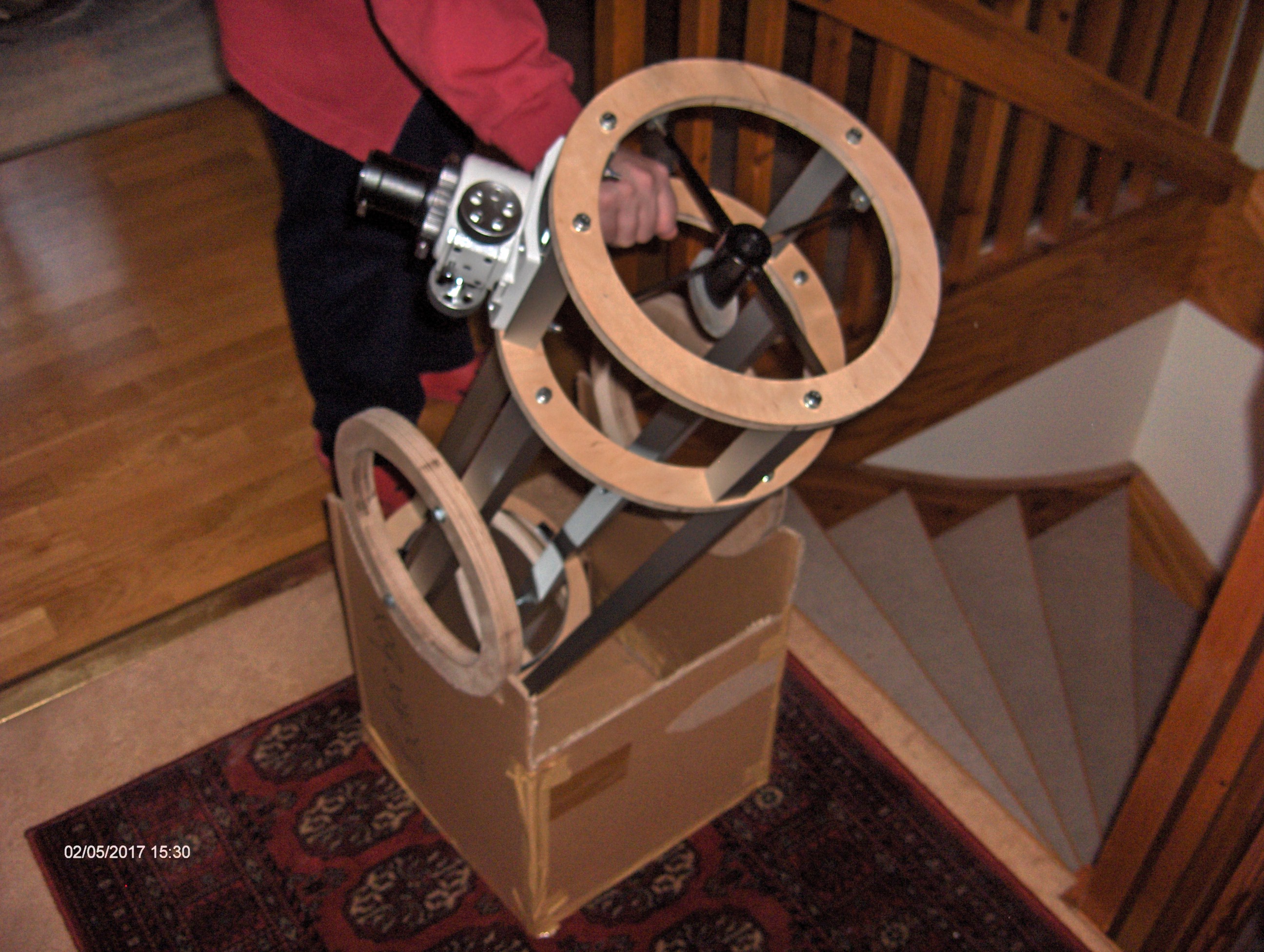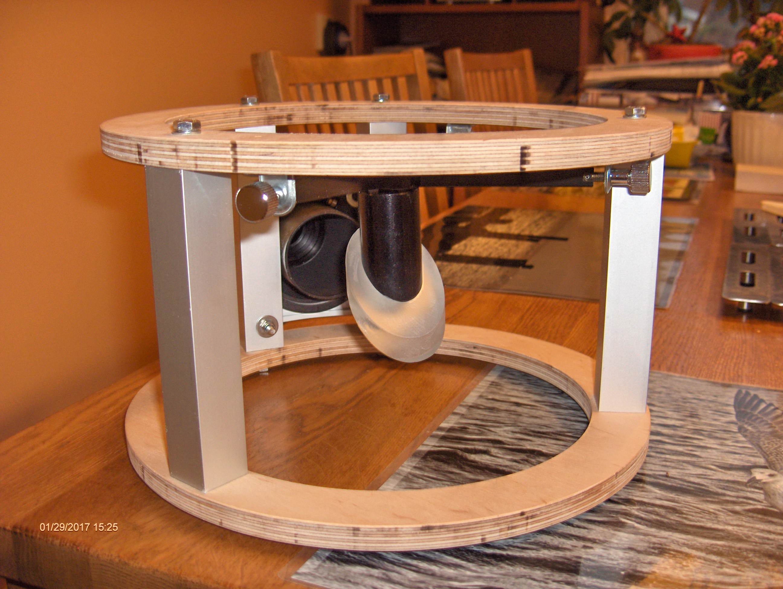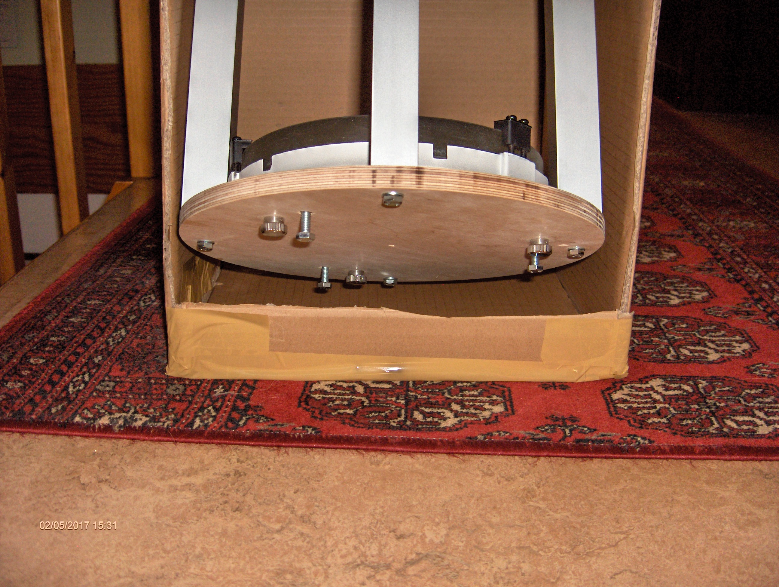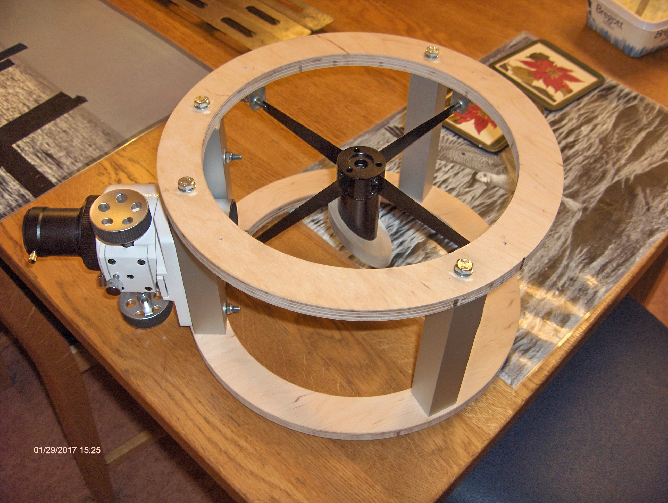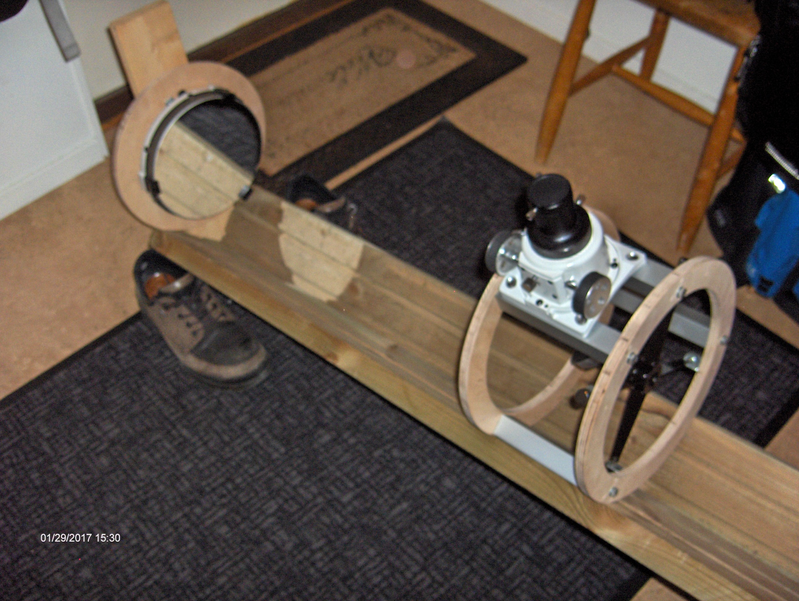 Det visade sig redan här bli vissa problem eftersom jag använder en betydligt större och tyngre fokuserare än Gary S så det blev nödvändigt att tillverka ytterligare en plywoodring och göra en konstruktion med en sekundärspegelbur.