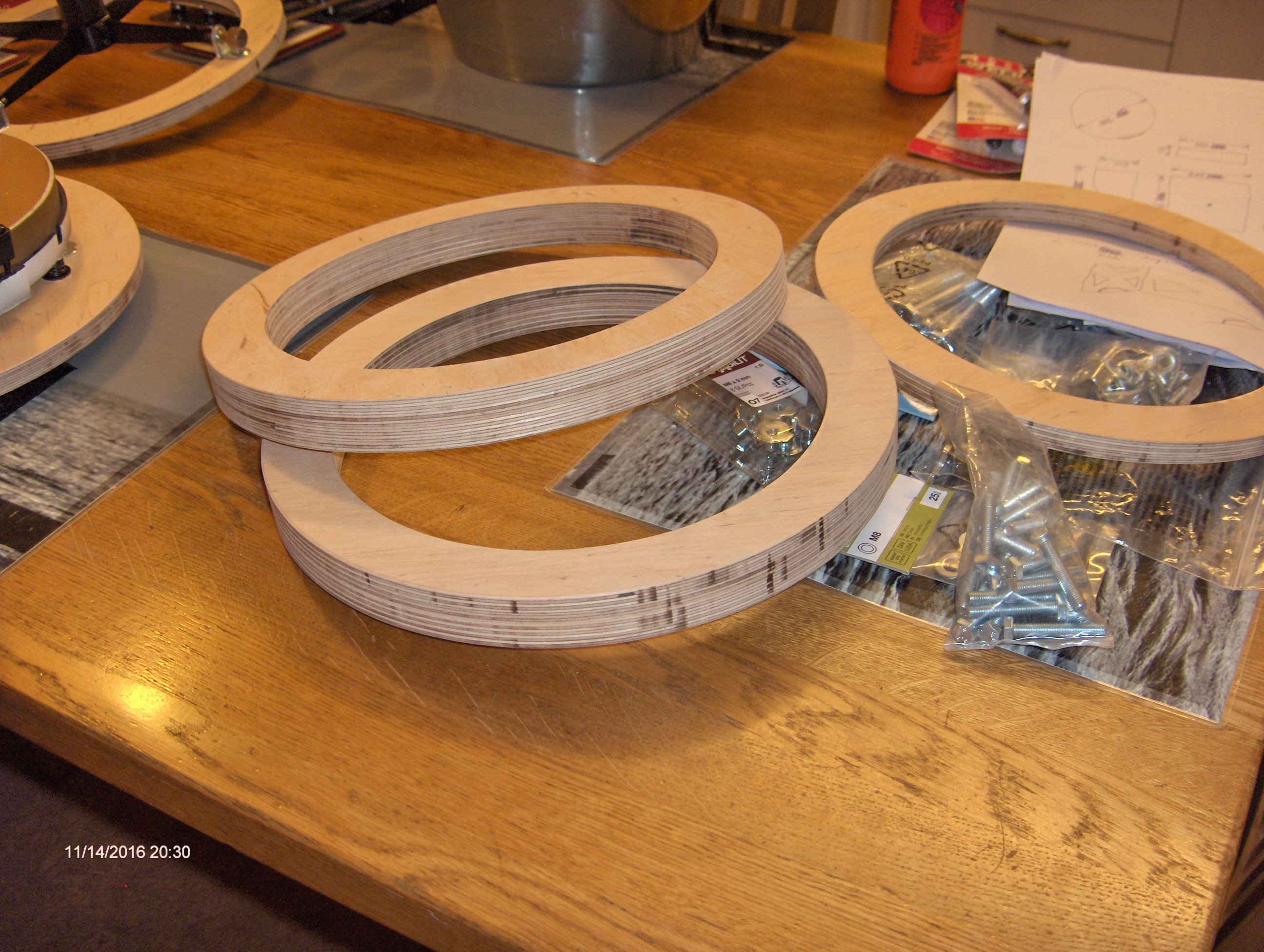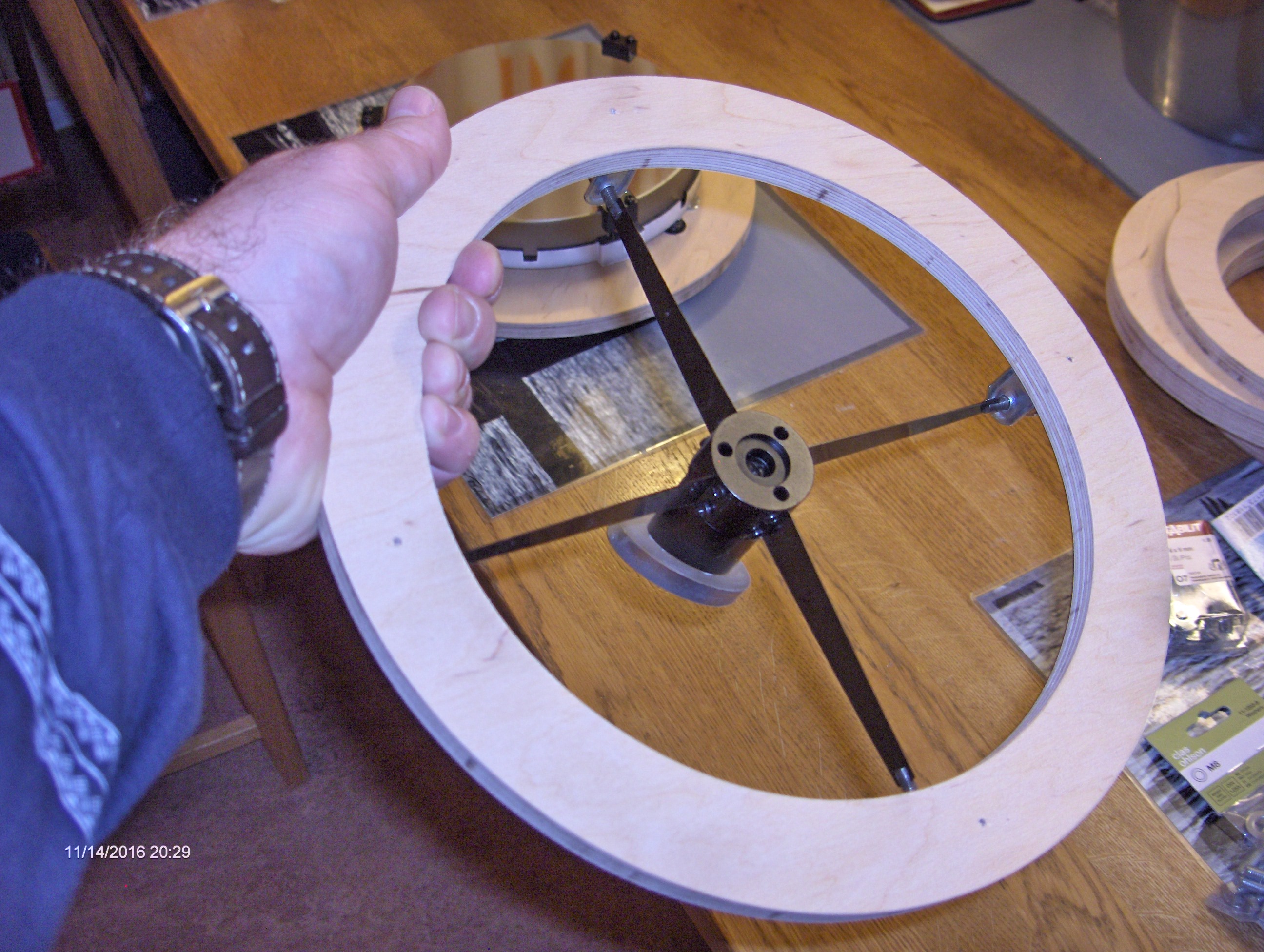 Det första vi tillverkade var de plywoodringar och den plywoodplatta som skall användas till primärspegelcellen, sekundärspegelhållaren och de båda höjdhjulen.
