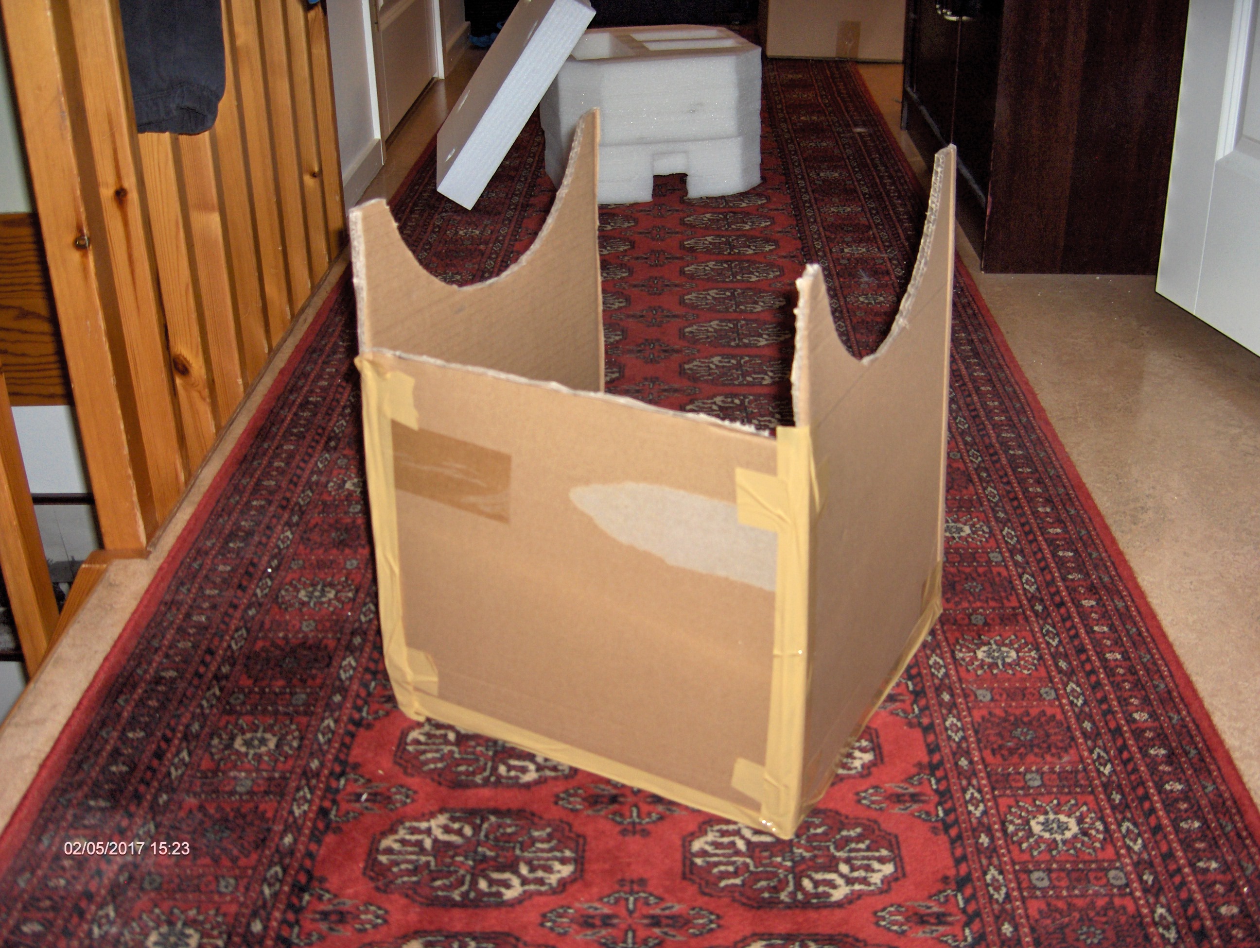 När jag kom hem snickrade jag snabbt ihop en synnerligen enkel provvagga för att kunna mäta den exakta längden på de längsgående stag som skall hålla ihop primärspegelcellen med sekundärspegelburen. Jag kollimerade någorlunda väl och riggade upp vaggan utomhus och riktade den ungefär mot Orion, stöttad mot en stor blomkruka, och lyckades genom att sakta skjuta sekundärspegelburen fram och tillbaka fokusera några stjärnor. Resultat: 685 mm. Jag har ingen aning om vad det var för stjärnor men det var så roligt att se dem