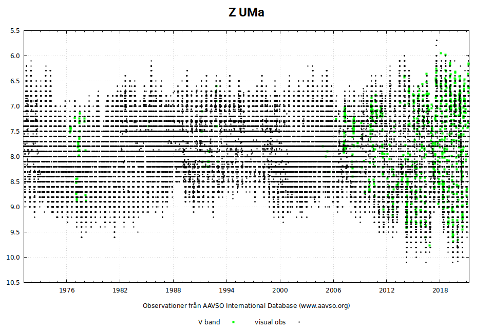 Z UMa har haft en intressant utveckling de senaste årtionden. Se nedan senaste 50 åren:
