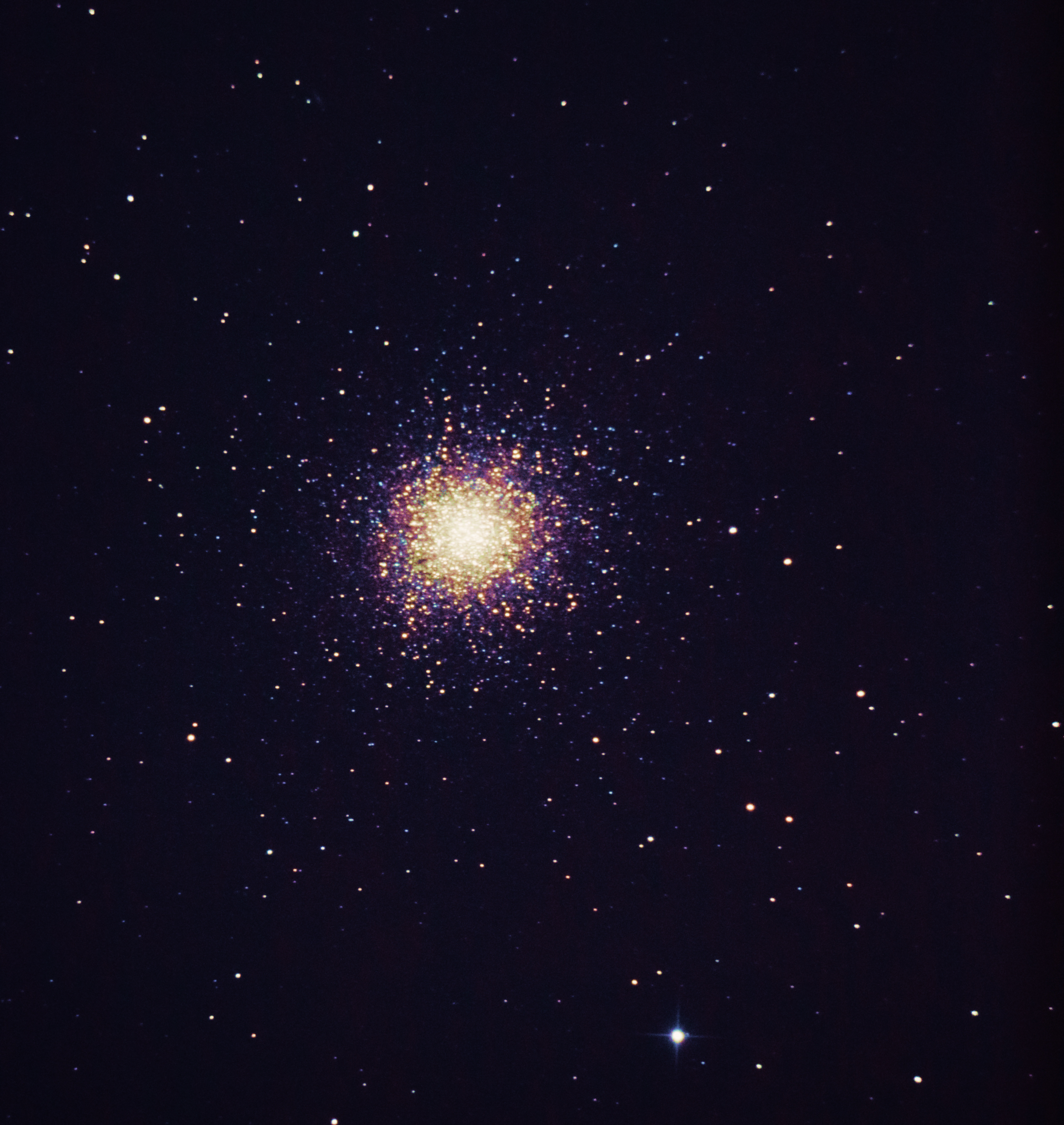Jag letade efter det karaktäristiska "Mercedes-tecknet" som finns i M13, men hittade det inte först. Det brukar synas i de yttre regionerna på bilder av M13. Sen såg jag att det i din bild ligger inne i den ljusa kärnan, så du har som Peter skriver fått med väldigt mycket av de svagare yttre regionerna.