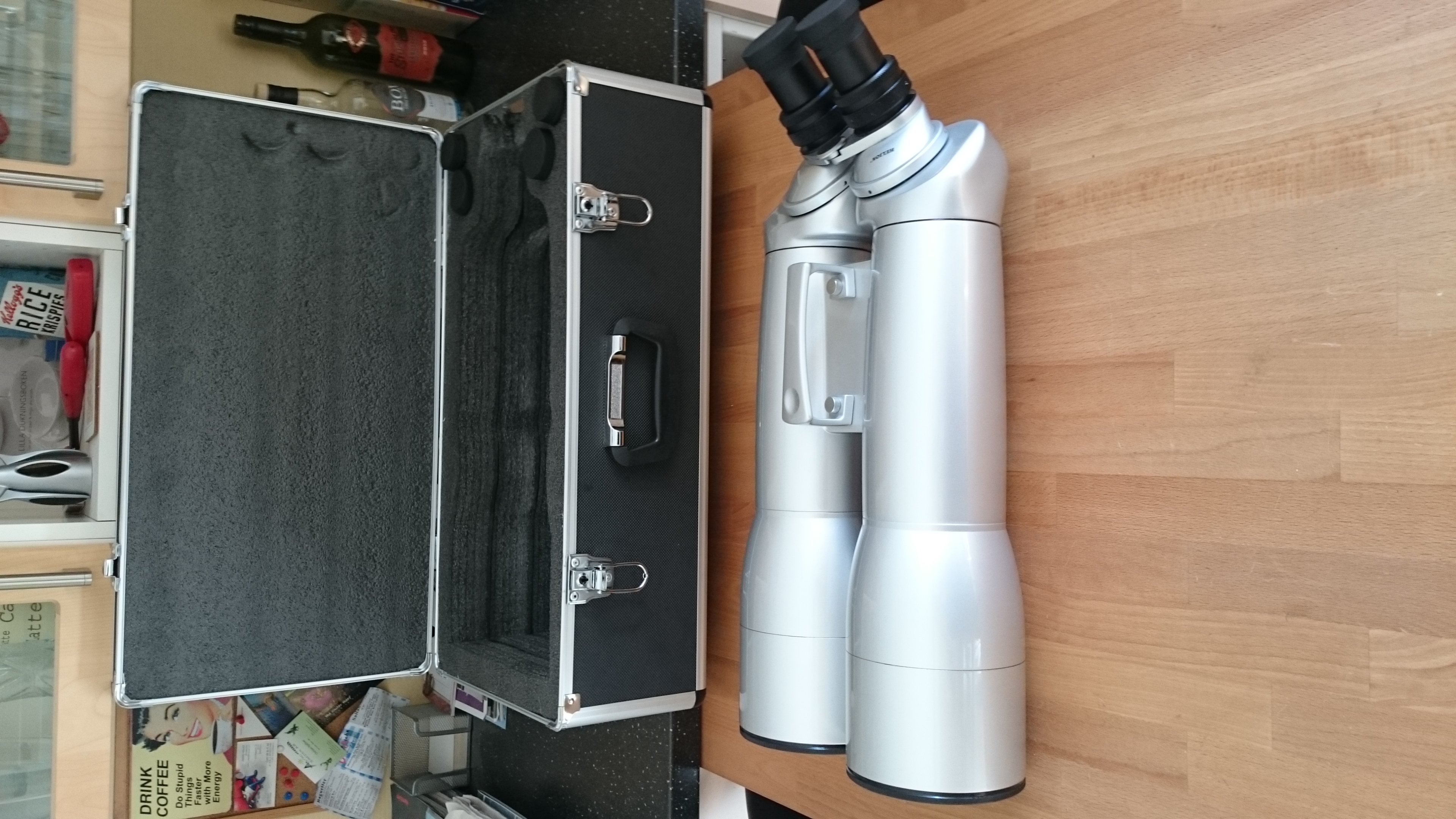 Säljer en stor observationskikare av modell Quantum-5 20/40-100. Den passar bra både för natur- och astronomiobservationer och har rejäla utdragbara dagghuvar till objektiven. Observera att du behöver ett bra stativ. Vikten ligger på ca 7kg. Det finns 2st 1/4-20 gängor men jag inkluderar en dovetail/laxstjärt för montering på astrostativ (se bild). Kikaren tar vanliga 1.25" okular. Det följer med 2 par originalokular av bra kvalitet som ger 20 resp 40x förstoring. Jag skickar även med 1 par Oberwerk 8mm okular som ger 70x förstoring och är bra för tex. månobservationer. Allt är i bra skick och ca 2 år gammalt. En av de uppvikbara gummikåporna till 20x okularet har en reva men det påverkar inte funktionen. Borde lätt kunna limmas. Förvaringsväska följer med.