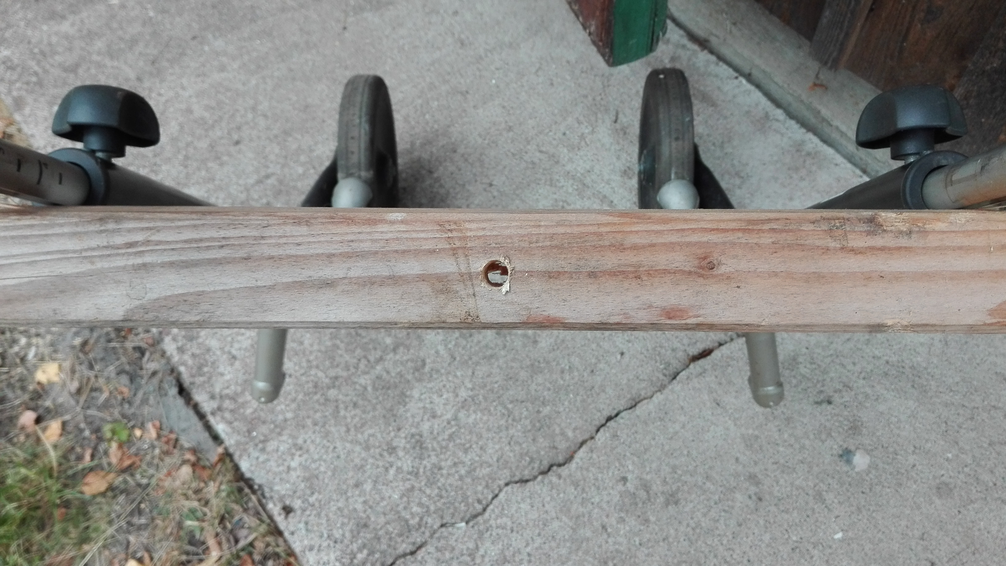 Så här enkelt har jag tänkt mig det. Hänger monteringen upp och ned med en 1/2" skruv i det här hålet. Skall nu bara få tag i en lämplig bult, helst med handtag, men de är sällsynta idag.