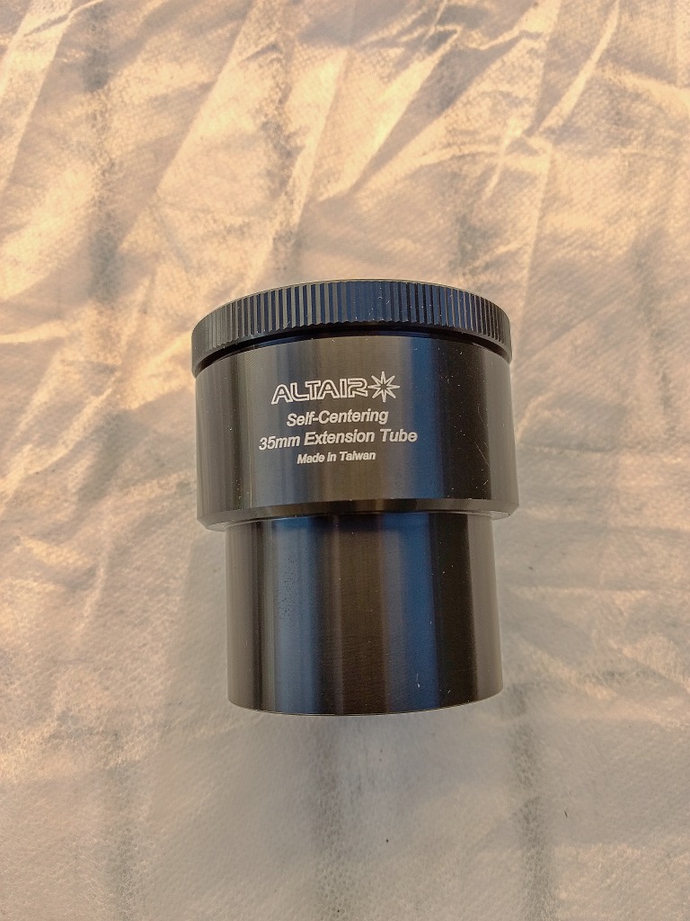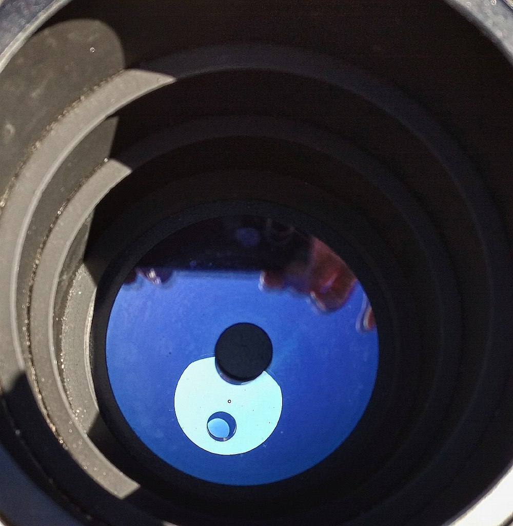 Teleskoptub: Intes Micro MN66 deluxe (huvudspegel av sital) med Baader Steeltrack-fokuserare, samt transport- och förvaringsväska. Data: öppningsdiameter 152 mm, brännvidd 952 mm, f/6,3. I botten av tuben finns ventilationshål, täckta av en löstagbar lucka.