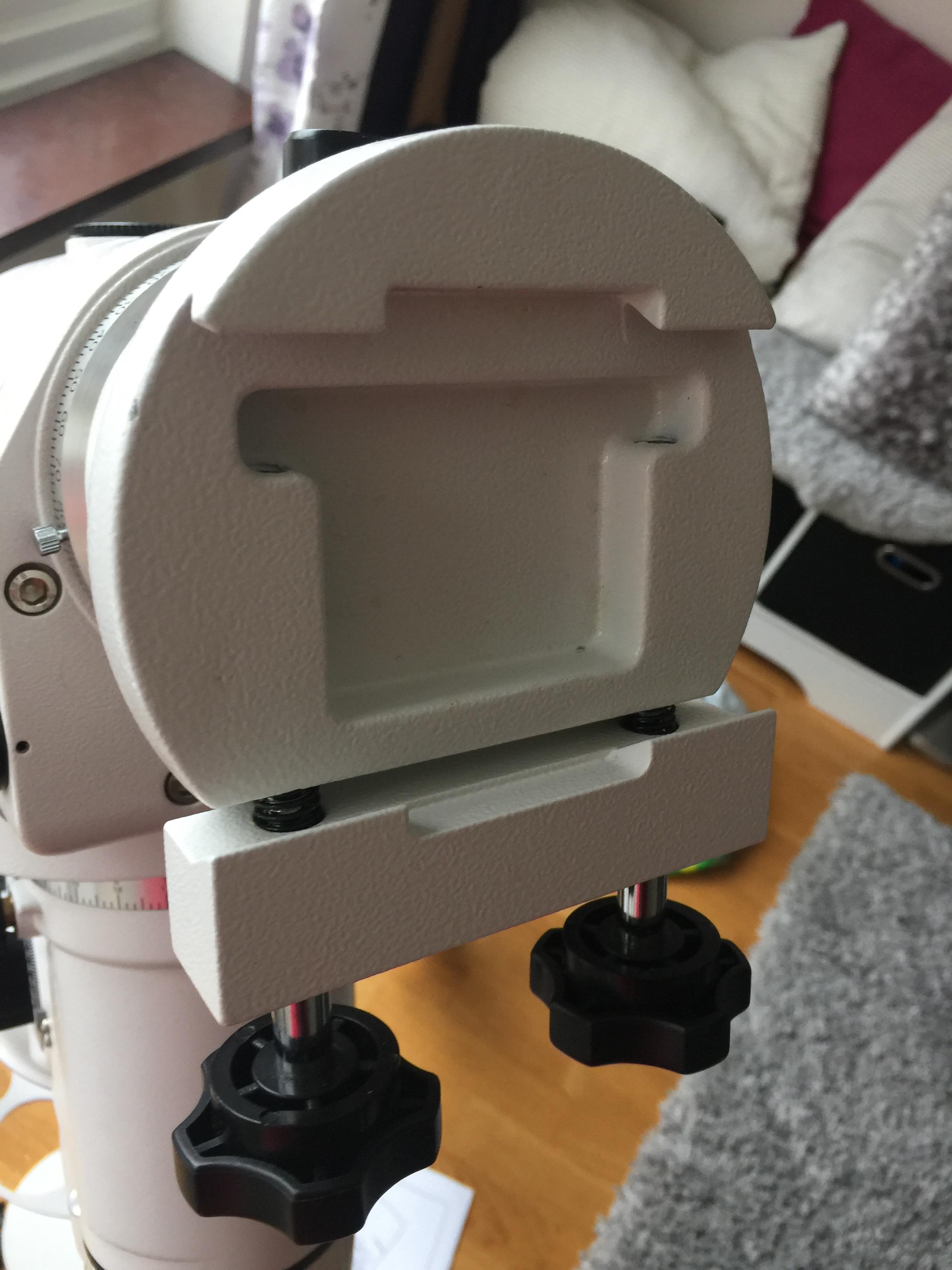 Jag tycker det ser ut som om du har en modifierad skenhållare på din EQ6. Det är bra för det blir mycket stabilare, men vanliga Vixenskenan lär inte passa, det skall vara den större varianten Losmandy.